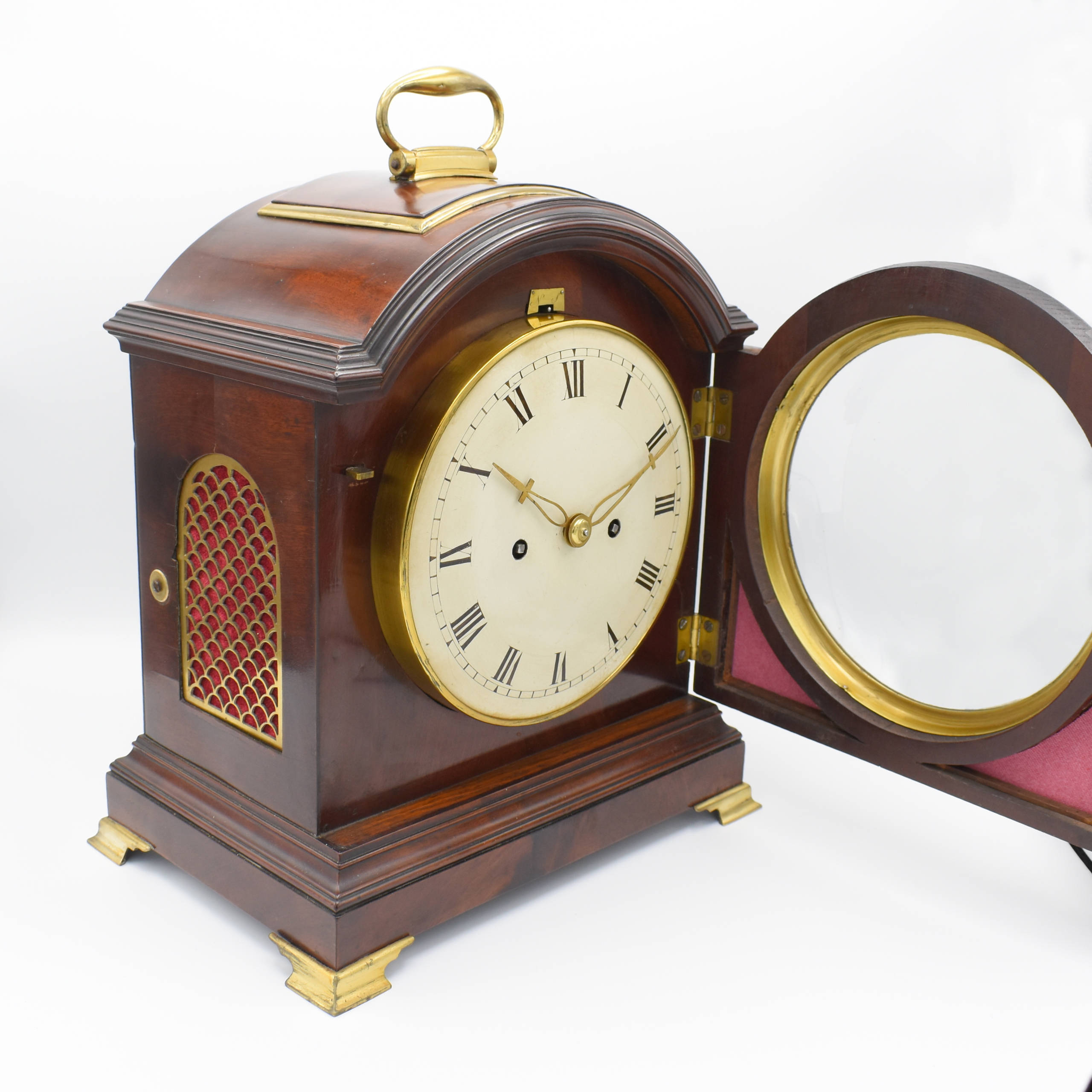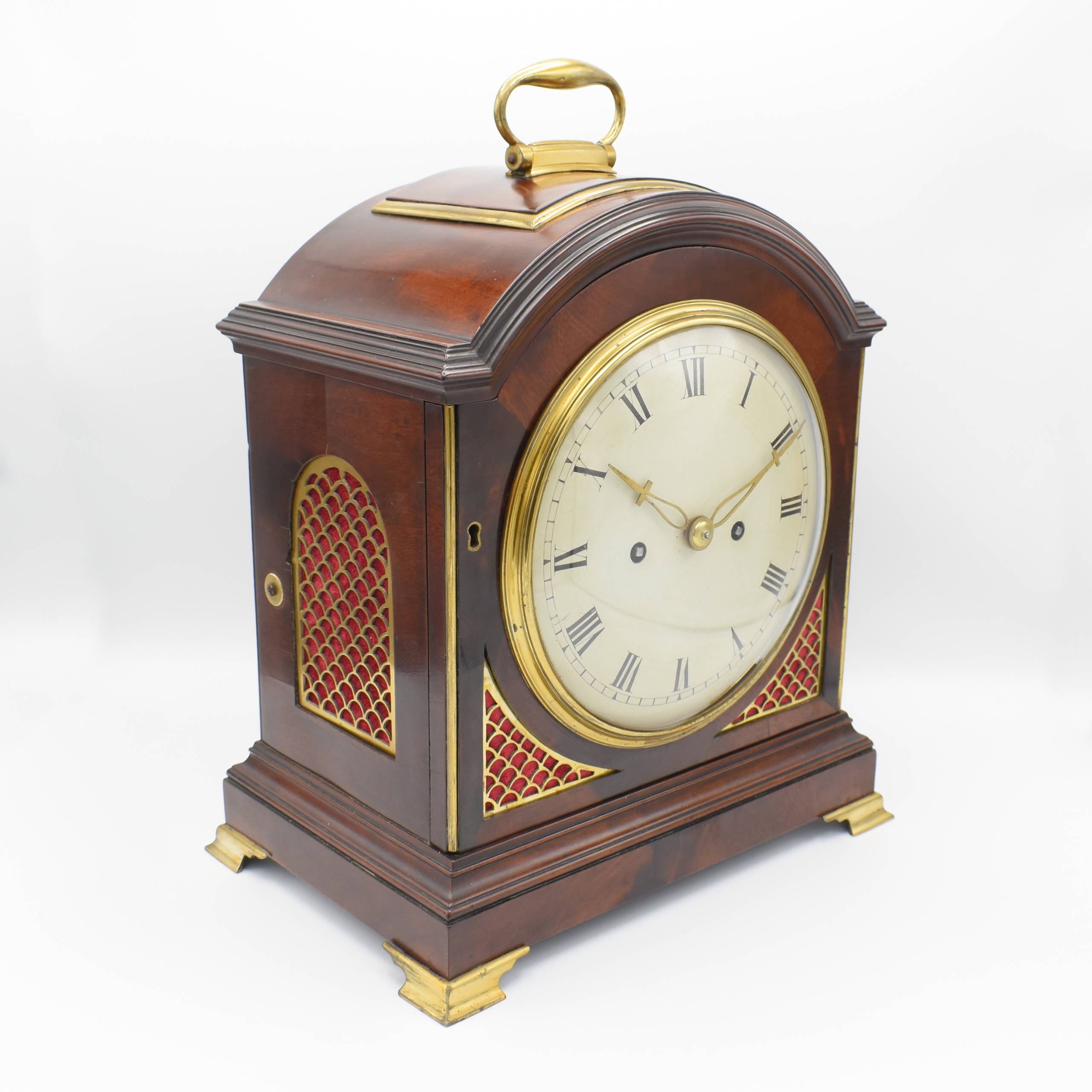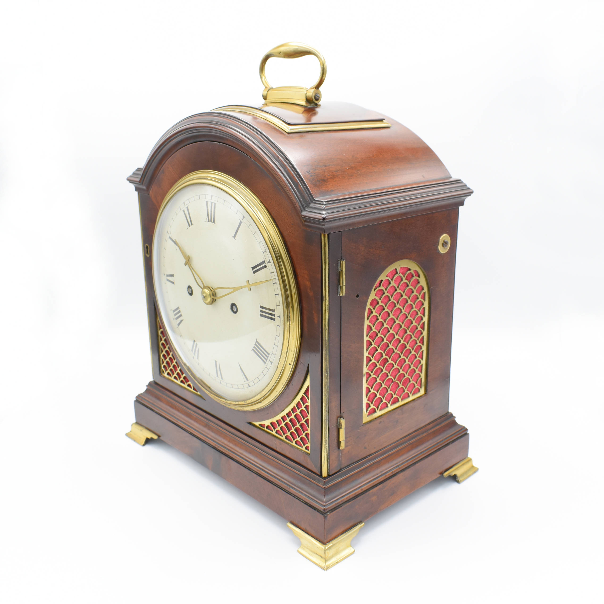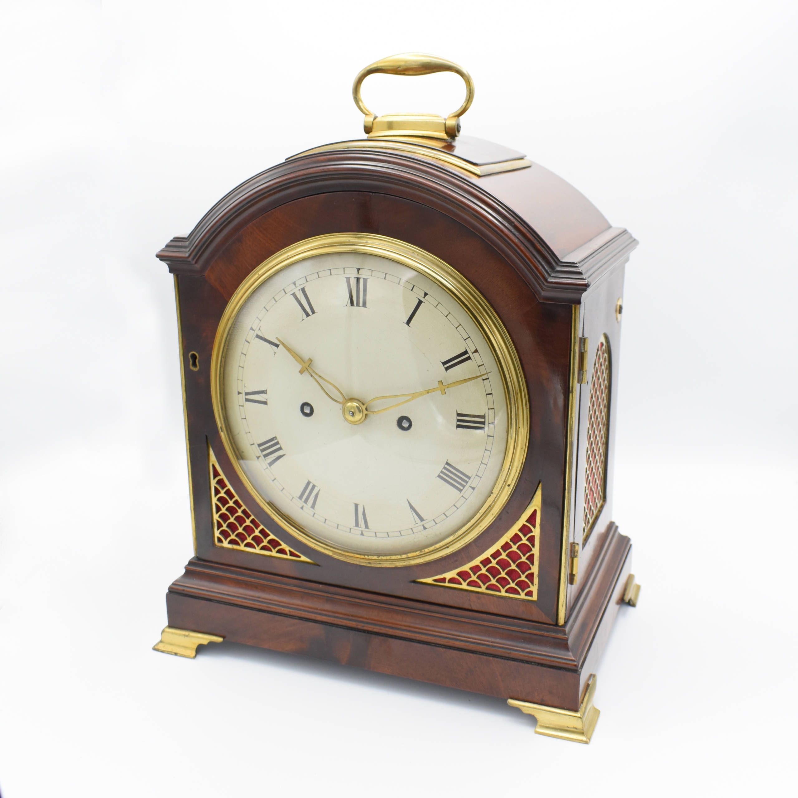 John Duterrau and John Perigal formed one of the partnerships Regency period London desired. Both extremely capable clock and watch makers, they were granted the Royal Warrant by George III. (We will be suppling a small book with the sale of this clock which goes into depth of the family’s histories and thier partnership) The clock is of small propiortions and compact with a full opening front allowing for the use of the Strike-Silent lever above the twelve. The clock has a trip repeat which sounds the last hour and the case is contructed of well chosen Mahogany with figured Mahogany to the front. The dial is convex and the hands are gilt brass. The carry handle is solid cast brass and that sits on a single ‘pad top’ edged with brass. Fish scale frets to both sides and a glazed rear door. Interestingly the rear of the dial is inscribed No name which usually means the clock was made for an important building/office in London. The twin fusee movement is beautifully engraved with the makers names in an oval. Please message us to reserve.