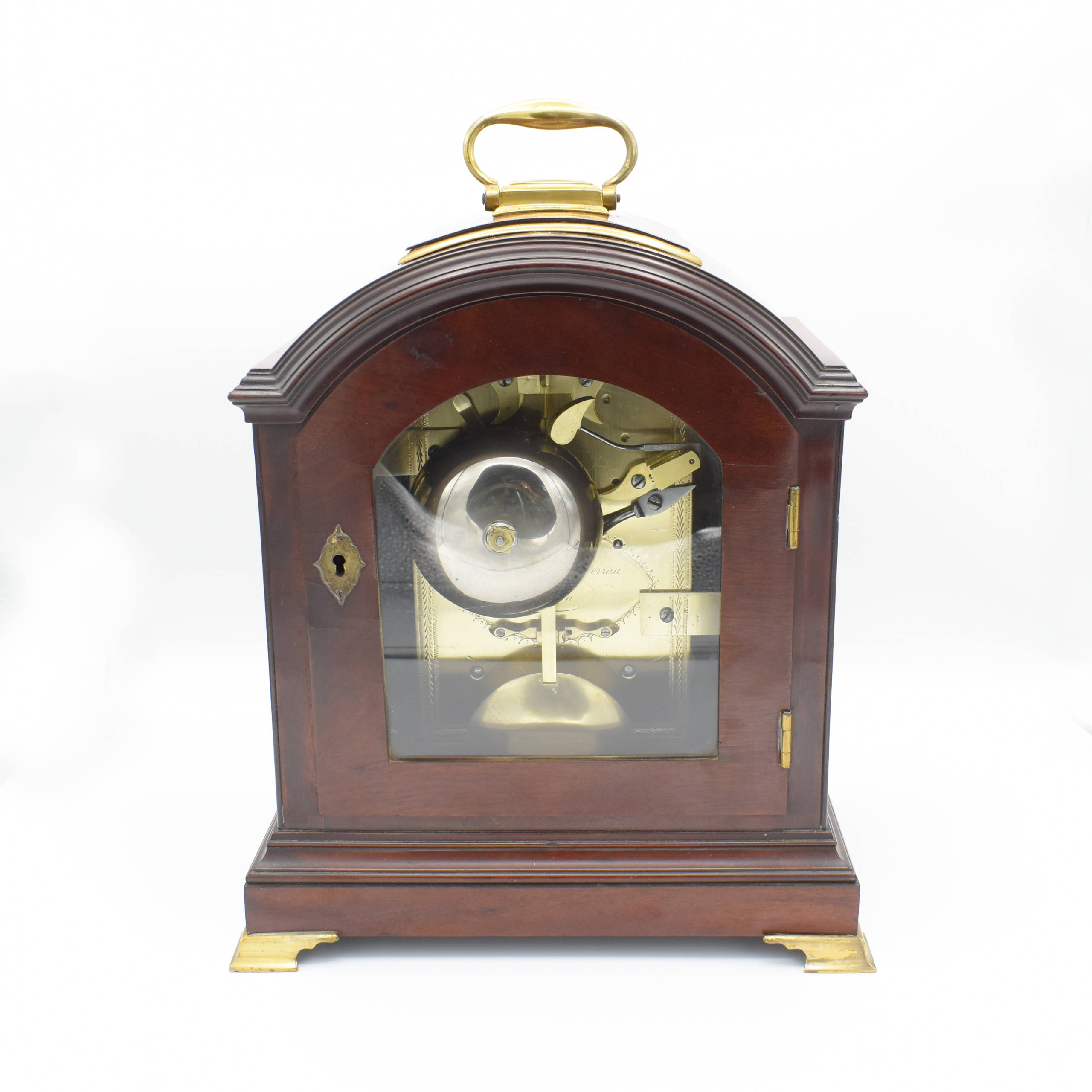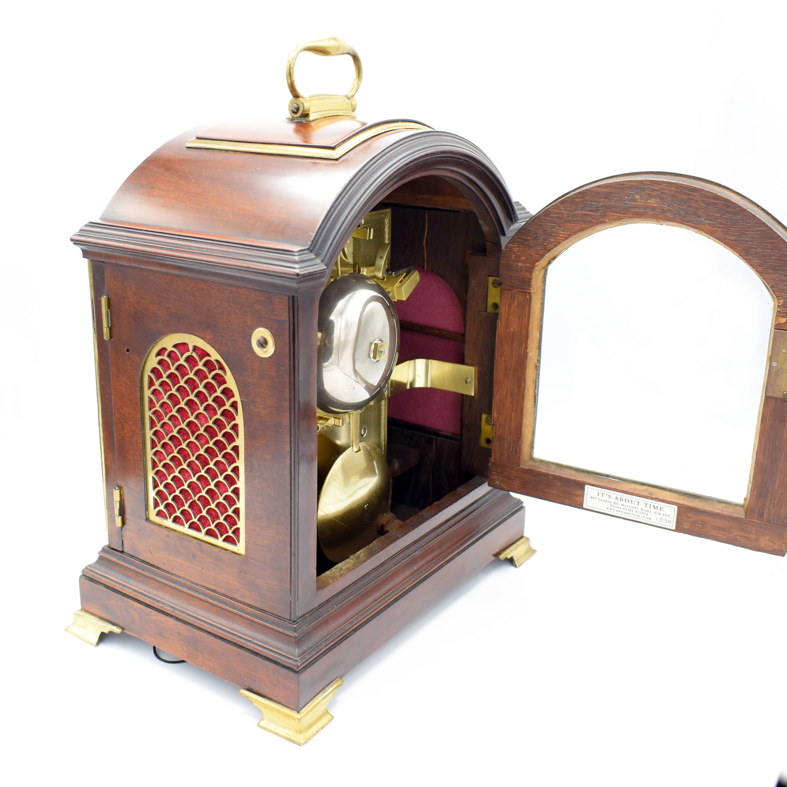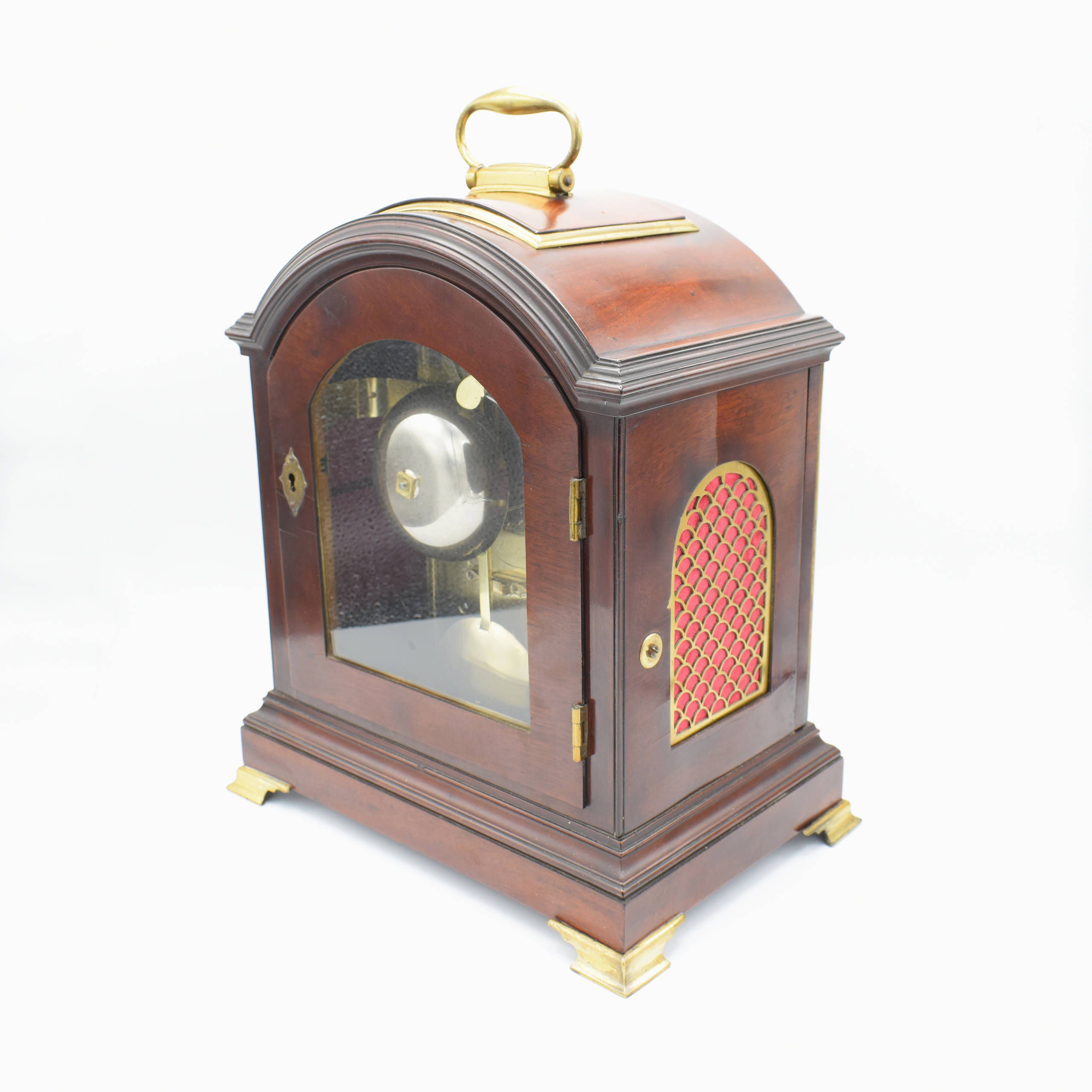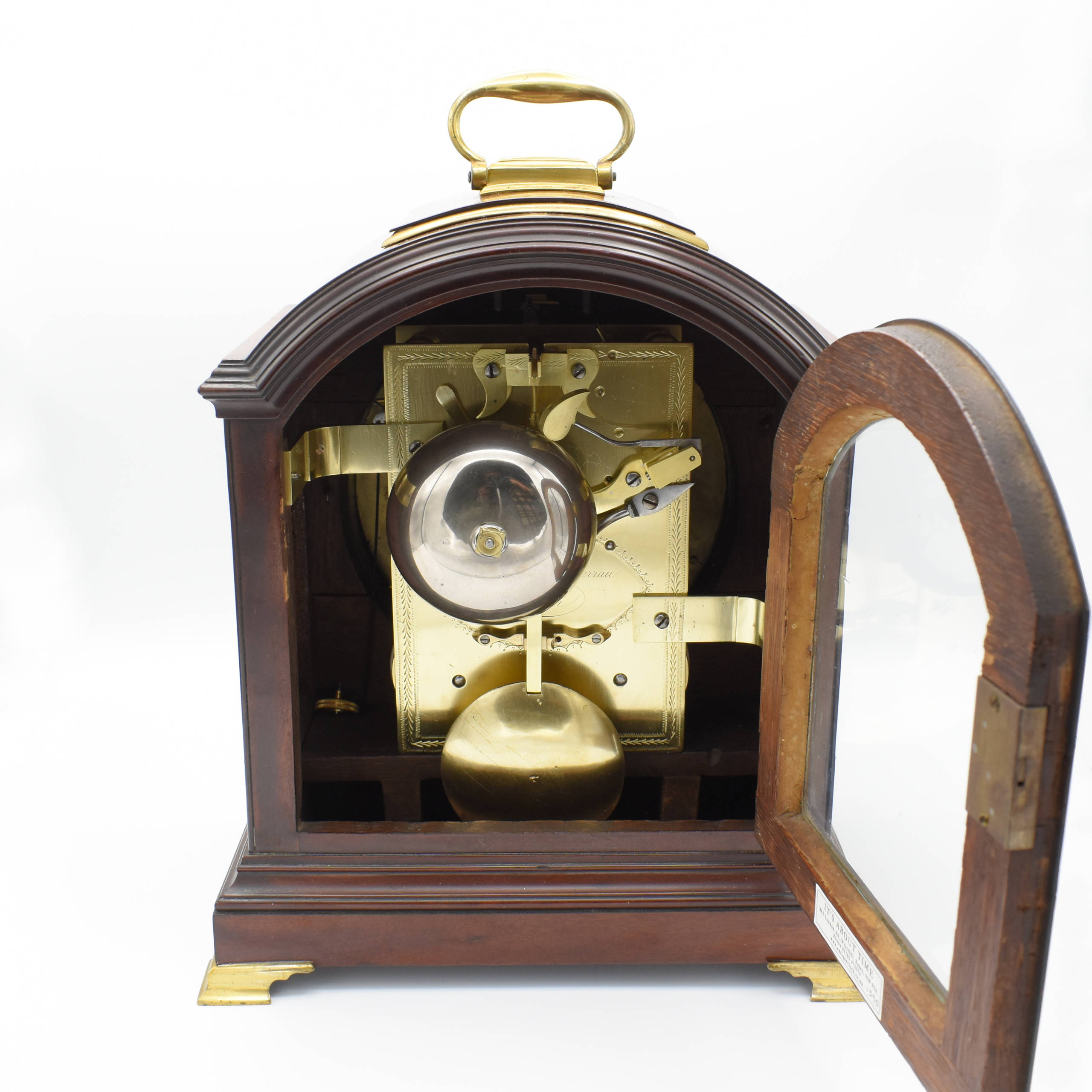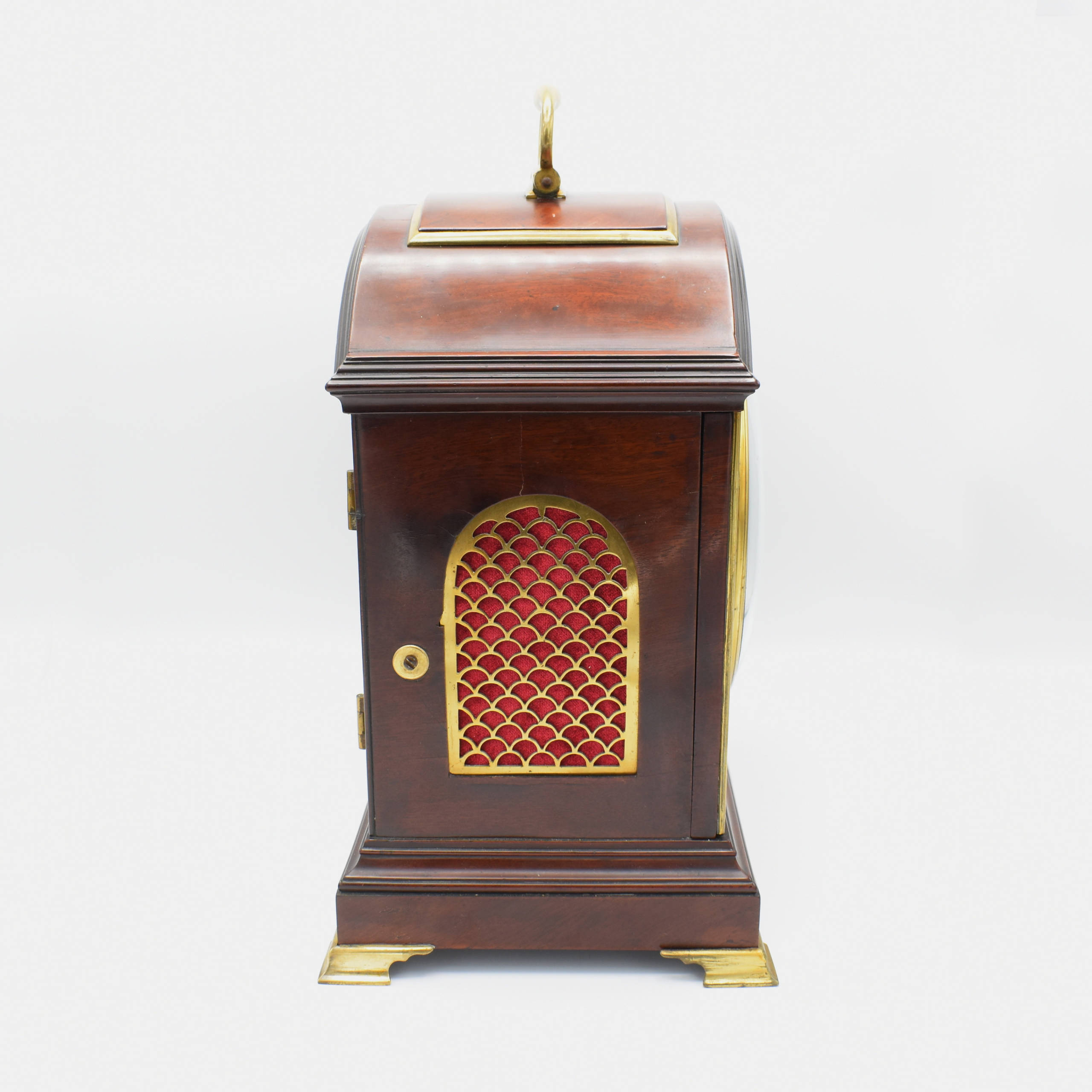 John Duterrau and John Perigal formed one of the partnerships Regency period London desired. Both extremely capable clock and watch makers, they were granted the Royal Warrant by George III. (We will be suppling a small book with the sale of this clock which goes into depth of the family’s histories and thier partnership) The clock is of small propiortions and compact with a full opening front allowing for the use of the Strike-Silent lever above the twelve. The clock has a trip repeat which sounds the last hour and the case is contructed of well chosen Mahogany with figured Mahogany to the front. The dial is convex and the hands are gilt brass. The carry handle is solid cast brass and that sits on a single ‘pad top’ edged with brass. Fish scale frets to both sides and a glazed rear door. Interestingly the rear of the dial is inscribed No name which usually means the clock was made for an important building/office in London. The twin fusee movement is beautifully engraved with the makers names in an oval. Please message us to reserve.