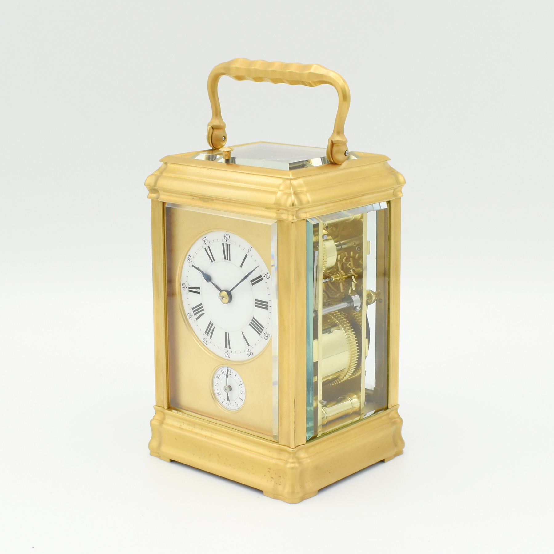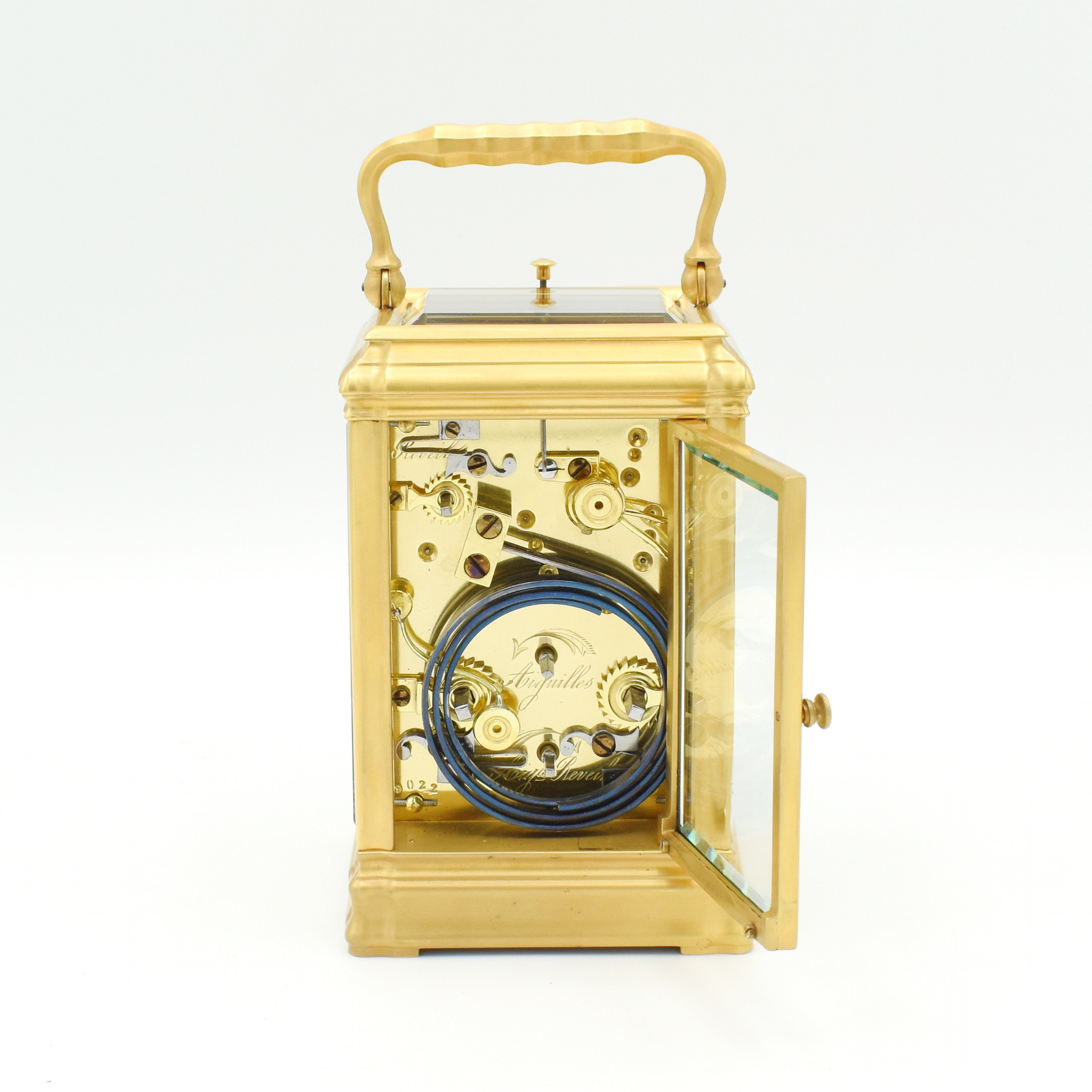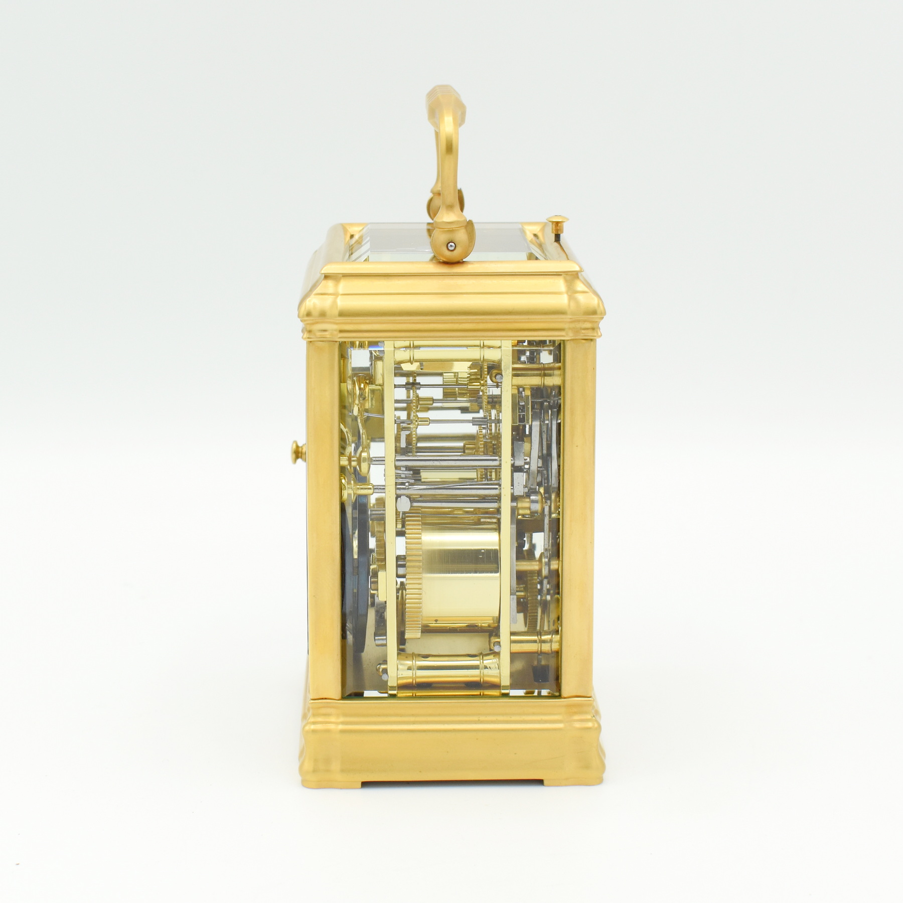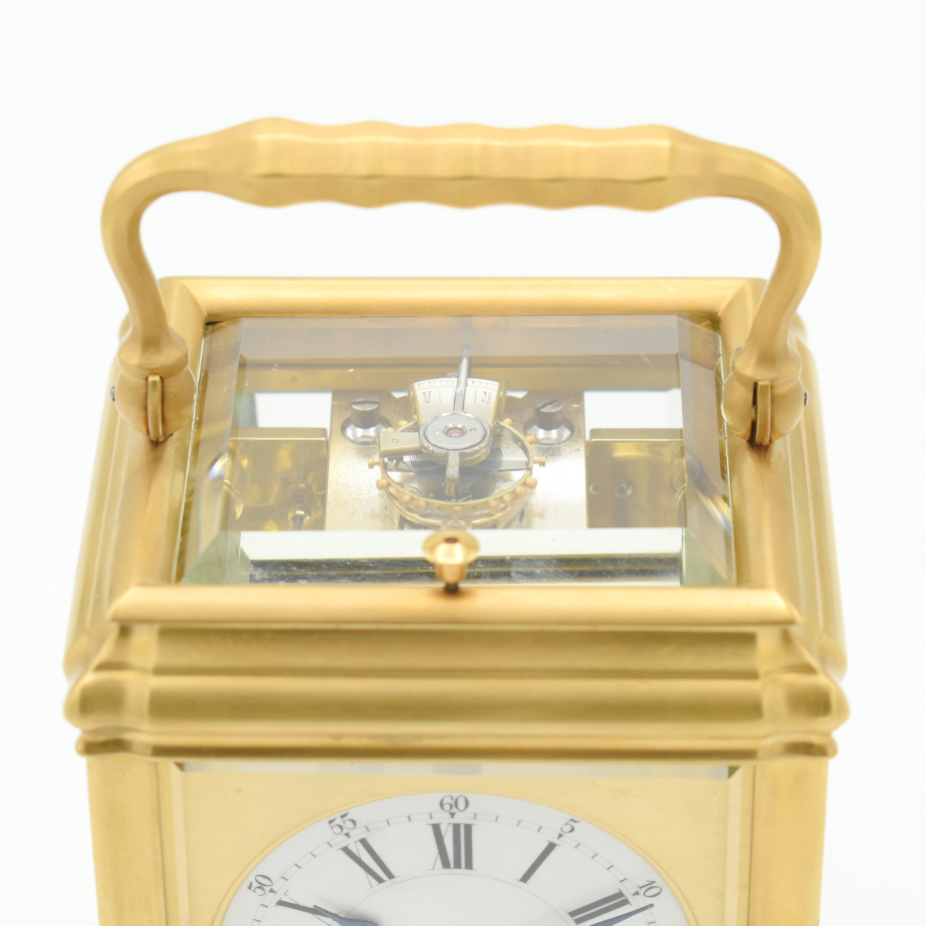 A small gilt cased carraige clock in the ‘Gorge’ style, surrounded by thick bevelled white glass. An attractive masked dial, showing Roman numerals and alarm aperature. The main dial is in great condition and shows the inner line within the Roman numerals, typical of Henri Jacot. This clock benefits from having quarter striking or what is known as a petite sonnerie, whereby the clock strikes the quarters automatically, and if the repeat button is pressed, will strike the full grande sonnerie (the hours and quarters). This clock has just undergone a full restoration and has all original parts, and original escapement. Sold with a 24 month guarantee.