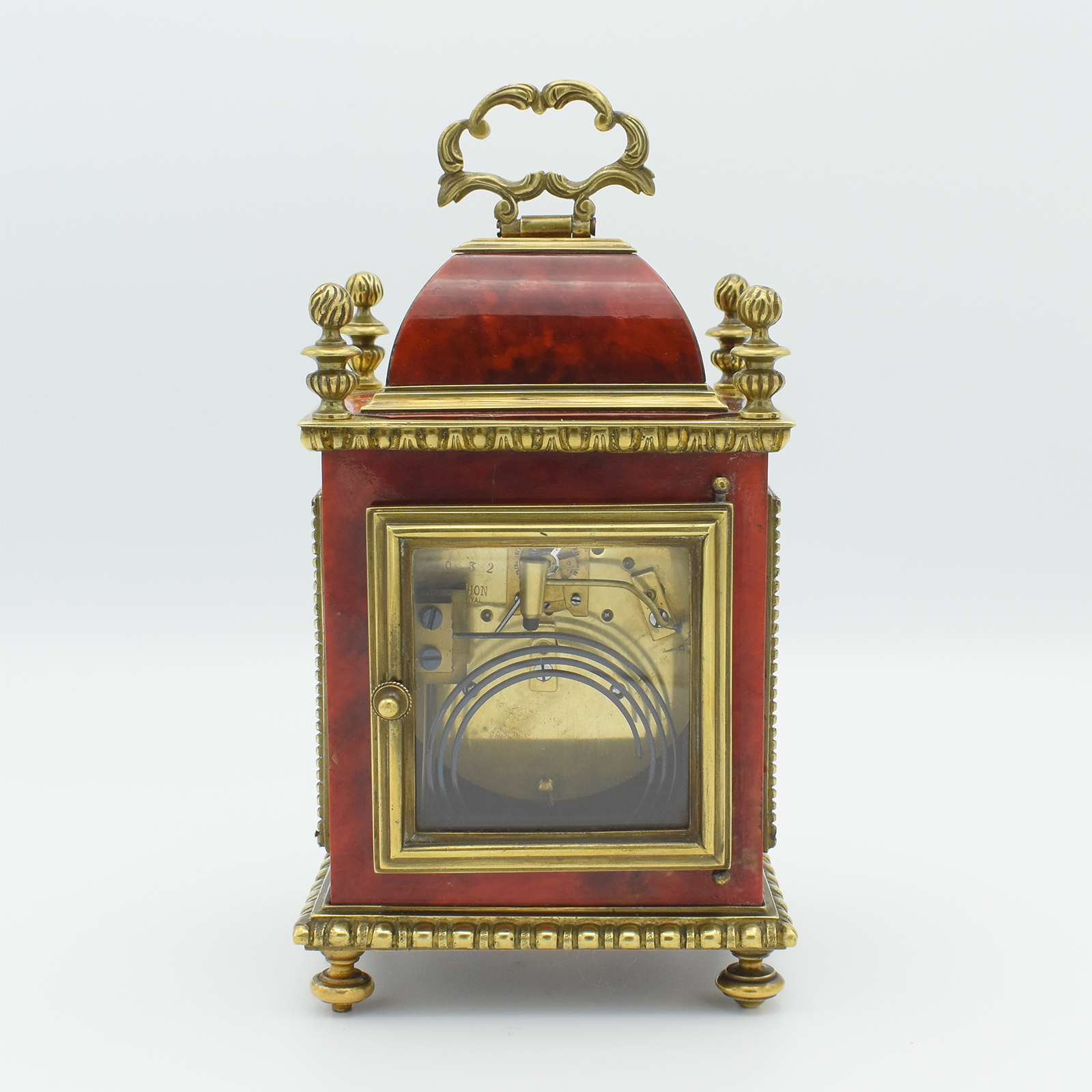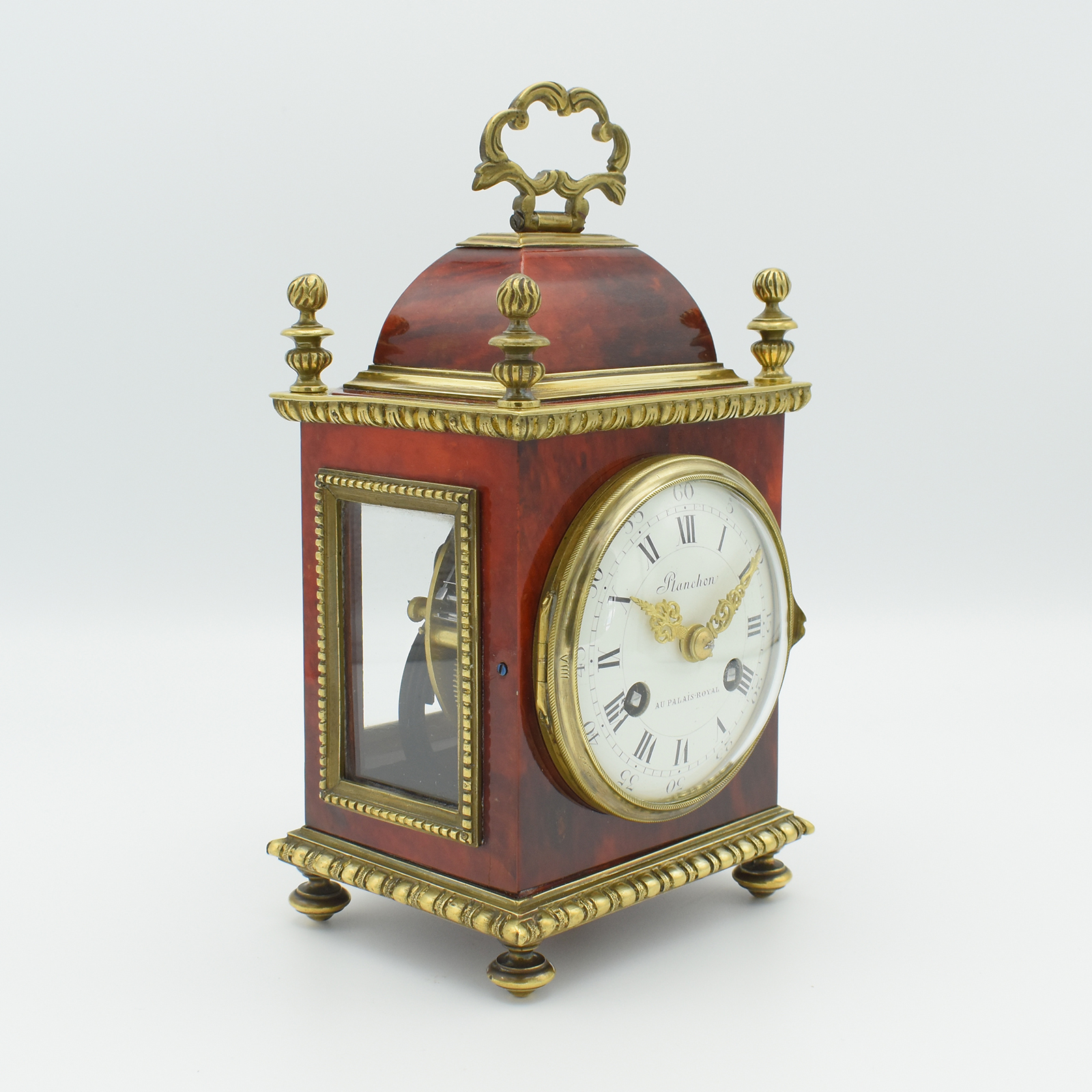 Here we are showing a rather impressive but diminutive clock by the well known Parisian clockmaker Planchon. The clock strikes on a soft coiled gong on the hours and half hours and has an 8 day ‘non pendulum’ movement. The Red shell case is not Tortoiseshell, it is a French laquer/resin that they used in the period and has a deep glossy Ruby lustre. The gilt decorations are very attractive and the handle is actually for carrying the clock from room to room as they may have done in the ‘old’ days! We have had 2 clocks by Planchon during the 41 years of being in business, here (at the same address). Planchon worked and had residence in the Palais Royal, Paris. We would encourage you to visit us to see this very fine little clock in the real world as it really is a little gem! Circa 1890.