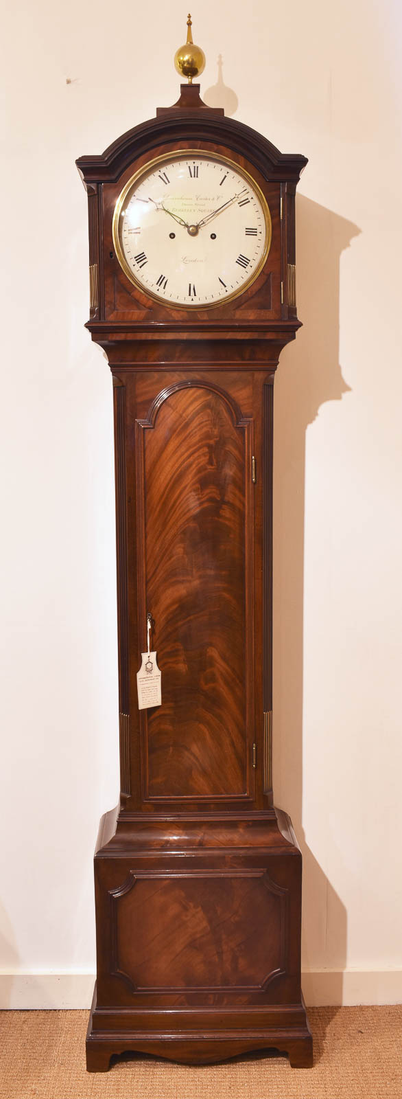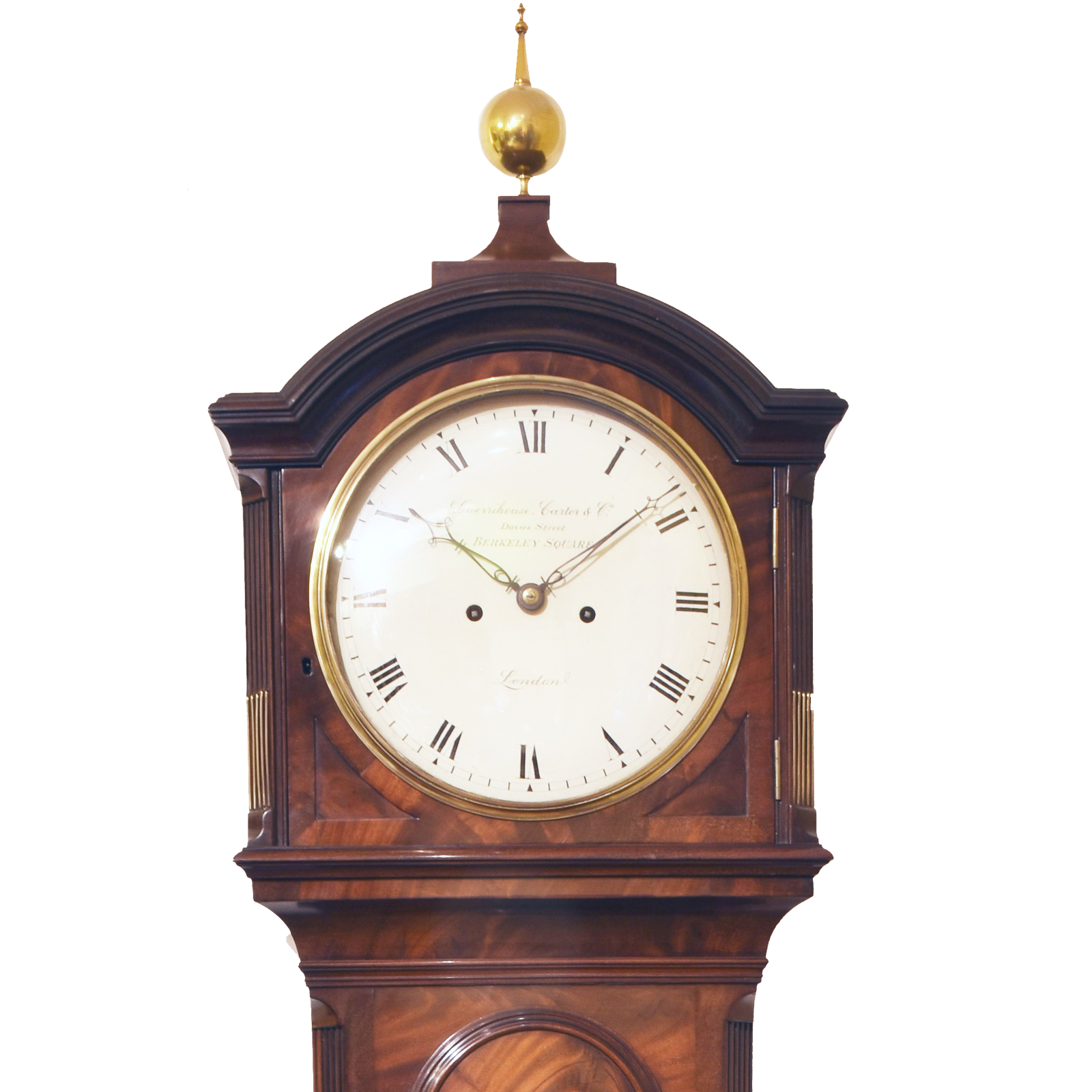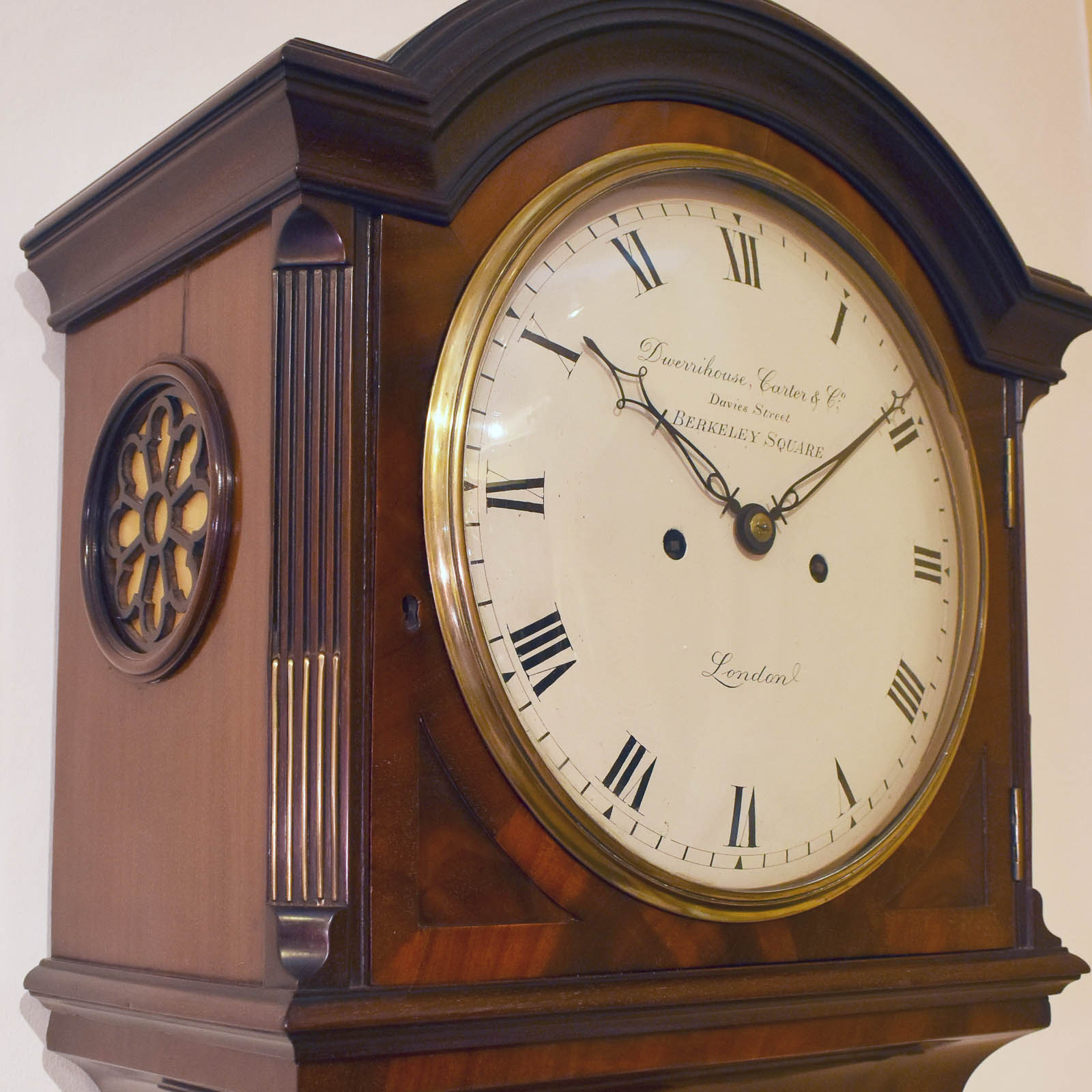 A superb of example of possibly the most elegant Longcase clock design of all time. The Regency longcase with round convex dial. This particular example is made by the Mayfair clockmakers Dwerrihouse & Carter of Berkeley square. The backplate of the movement is signed (engraved) with their name too. The original convex dial with original enamel is signed by the Makers and has very elegant Regency period original hands. The clock is wound once a week and strikes the hours on a bell. The very ‘figured’ flame mahogany case is perfectly proportioned and retains the original double plinth to the base. Please come and view this clock in our shop showrooms as we think you’ll agree, this is rather splendid! Sold with a two year guarantee and delivery within 100miles of our shop. Please note the height is measured to the tip of the removeable finial.