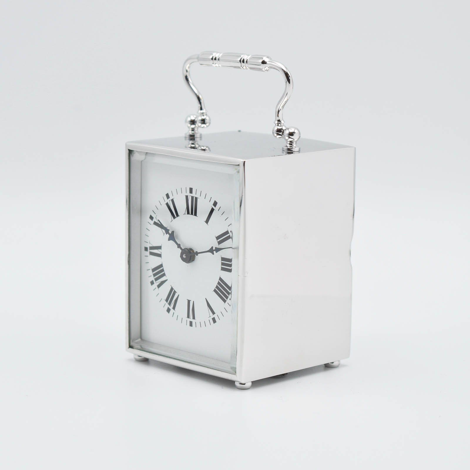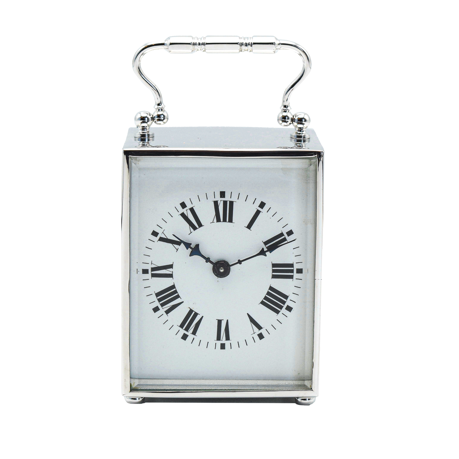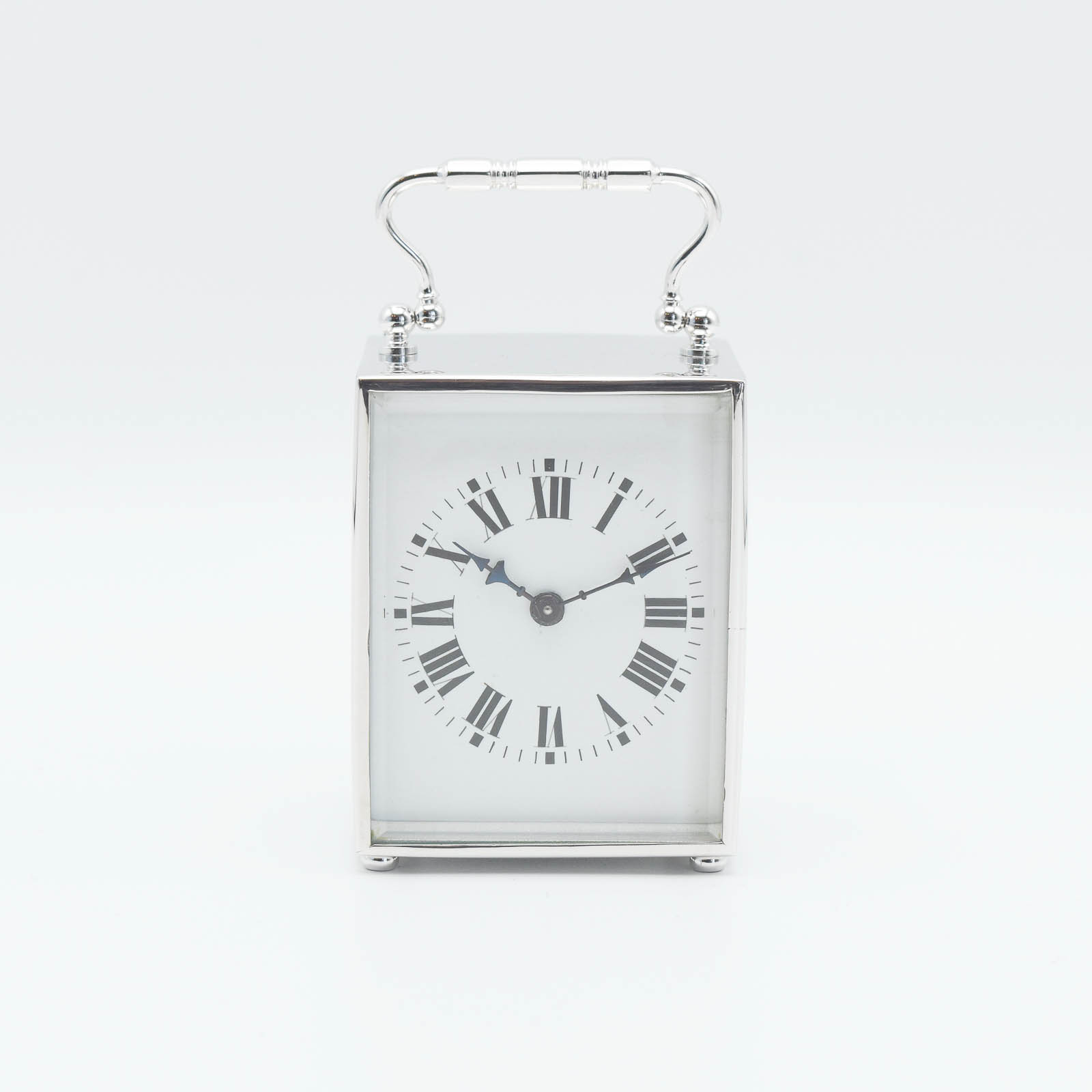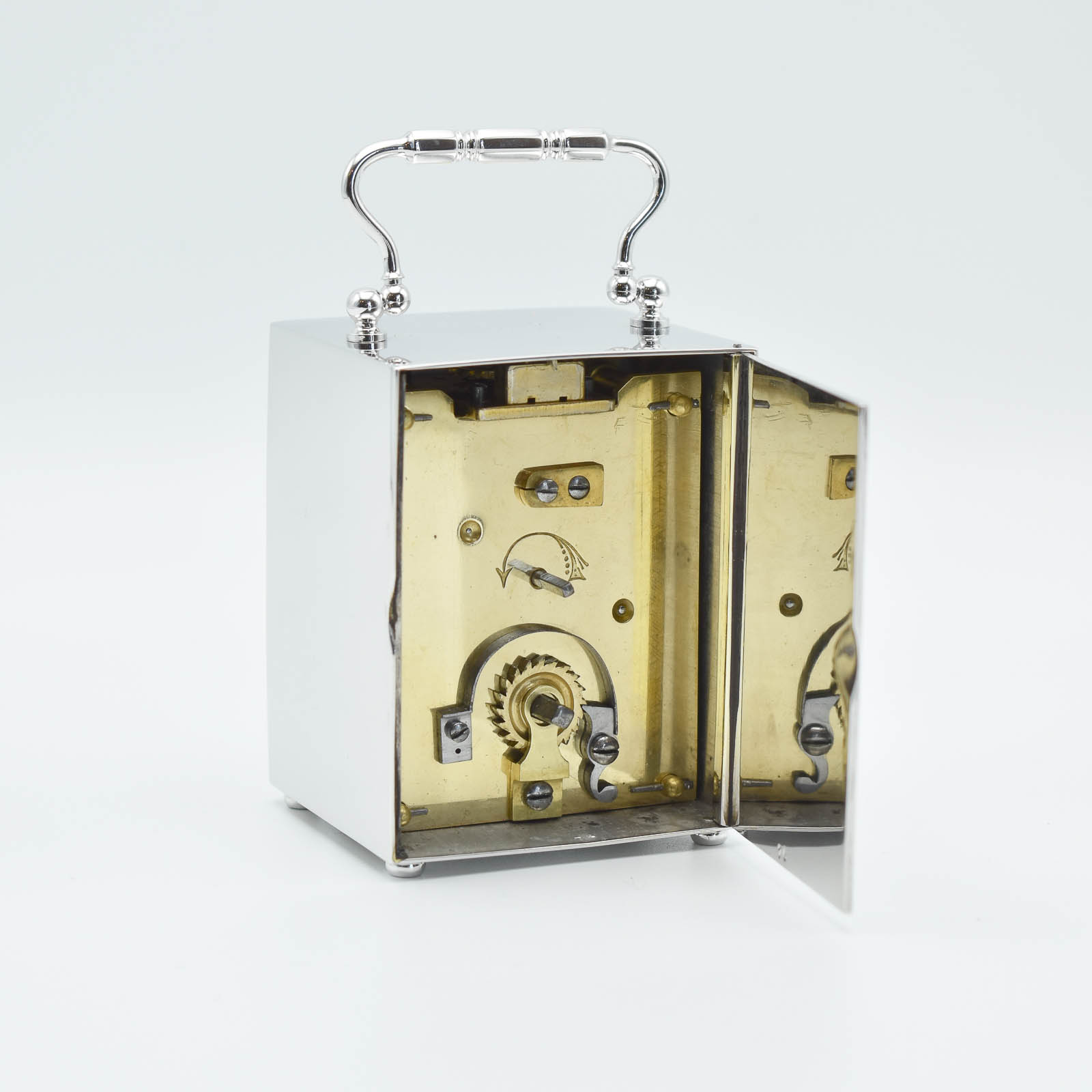 A very small and attractive timepiece with a Roman numeral enamel dial, blued steel hands. wound once a week with a key. The case is constructed of solid brass which is coated in Rhodium the Whitest of all precious metals and the most expensive. Normally these would be Silver Plated which tarnishes and is quite soft. Rhodium is much more appealing and durable. Will make a truly unique and memorable gift.