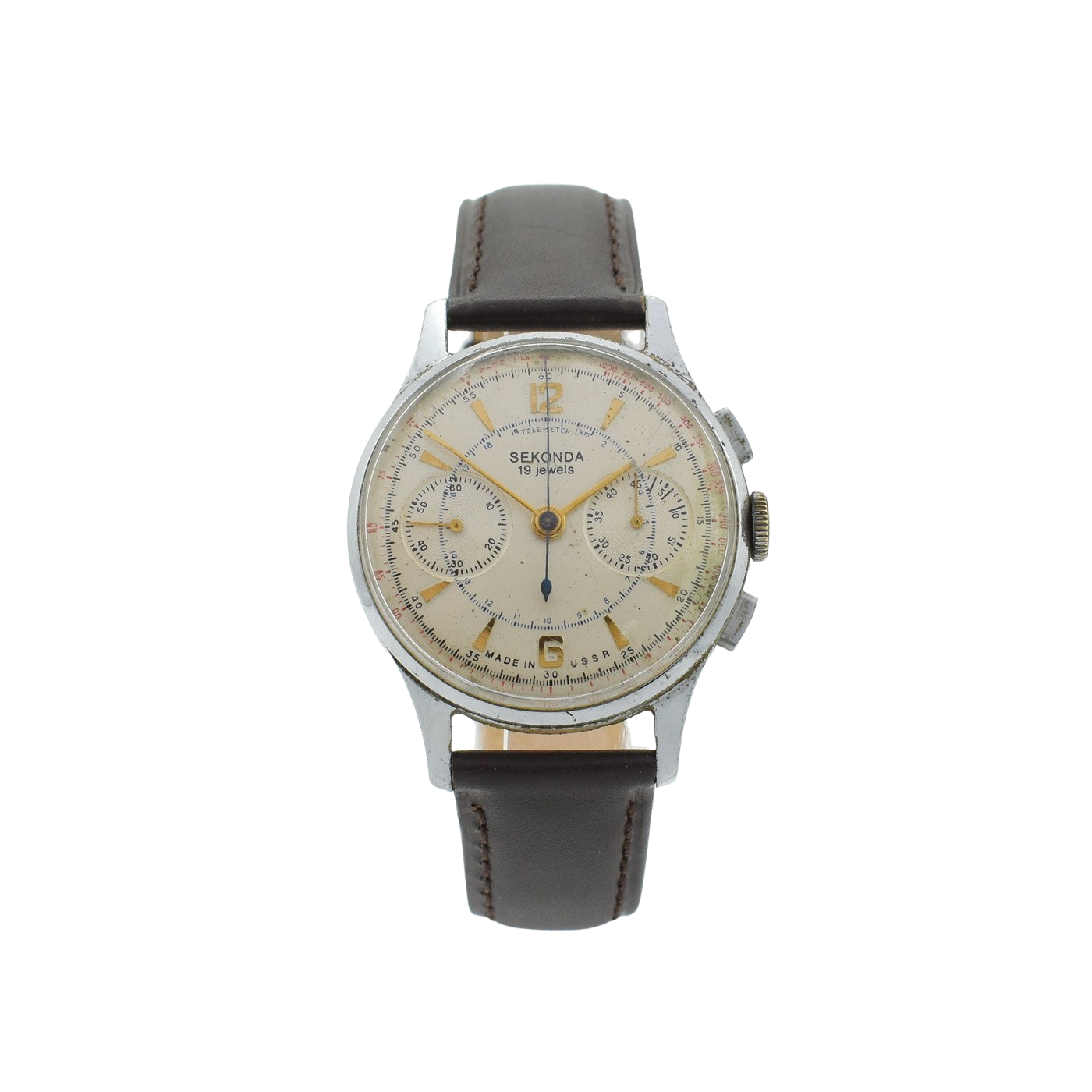 Sekonda emerged in 1966 as the British arm of the Russian watch making industry, exporting some of the finer watches made in Soviet Union factories. Many Sekonda watches were re-badged Strela and Raketa models made to be sold in the West. This model would have been manufactured and retailed in the late 60s, after Alexei Leonov wore the Strela during the first human spacewalk in history in March 1965, identical to this watch but for the Cyrilic ‘Strela’ on the dial, instead of ‘Sekonda’. Leonov spent a total of 12 minutes and 9 seconds outside of the ship during the Voskhod 2 mission, and the watch performed, although unfortunately he did not test out the chronograph function! His space suit inflated considerably due to lack of exterior pressure, and he was forced to bleed air out of the suit in order to re-enter the airlock, later crash landing in the deep snow of the Ural mountains after a malfuction of the automatic re-entry system. Despite this, both crew members survived, and the mission was considered a success, with the milestone achievement of the first spacewalk, the Strela being part of this history.
