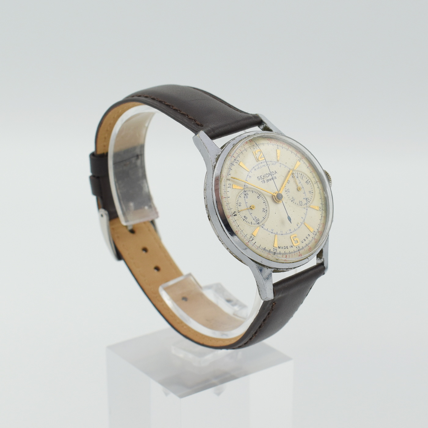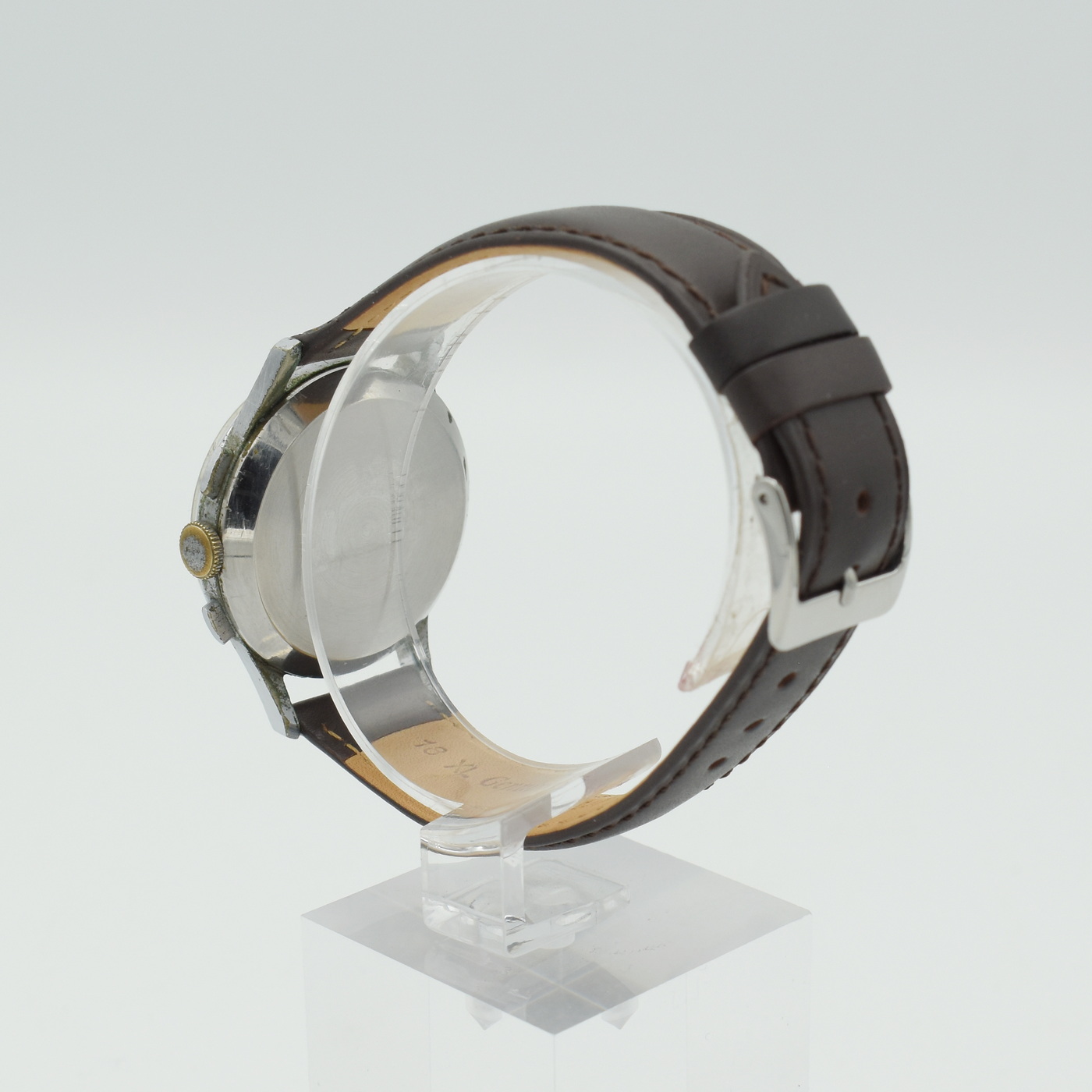 A very rare vintage Russian cosmonauts watch made in the USSR with the Sekonda brand. Inside is the Strela 3017 movement, introduced in 1959 by the 1st Moscow Watch Factory (1. MWF, renamed to Poljot after 1964), and one of the first chronograph movements produced in the Soviet Union. A reliable and robust movement, it was apparently only available to the Soviet Air Forces and a few higher-ranking officials at first, before becoming more widely available in the later half of the 1960s.
