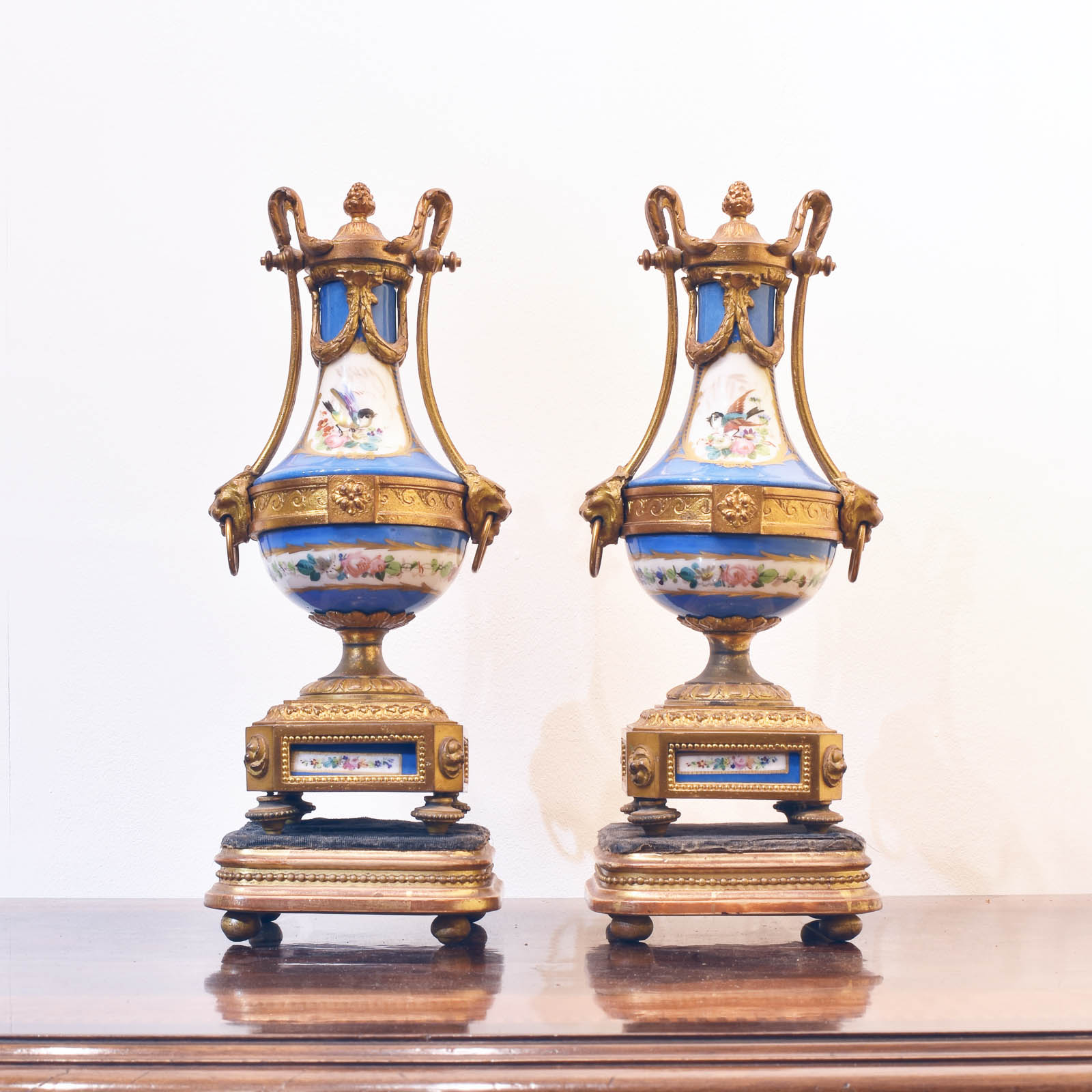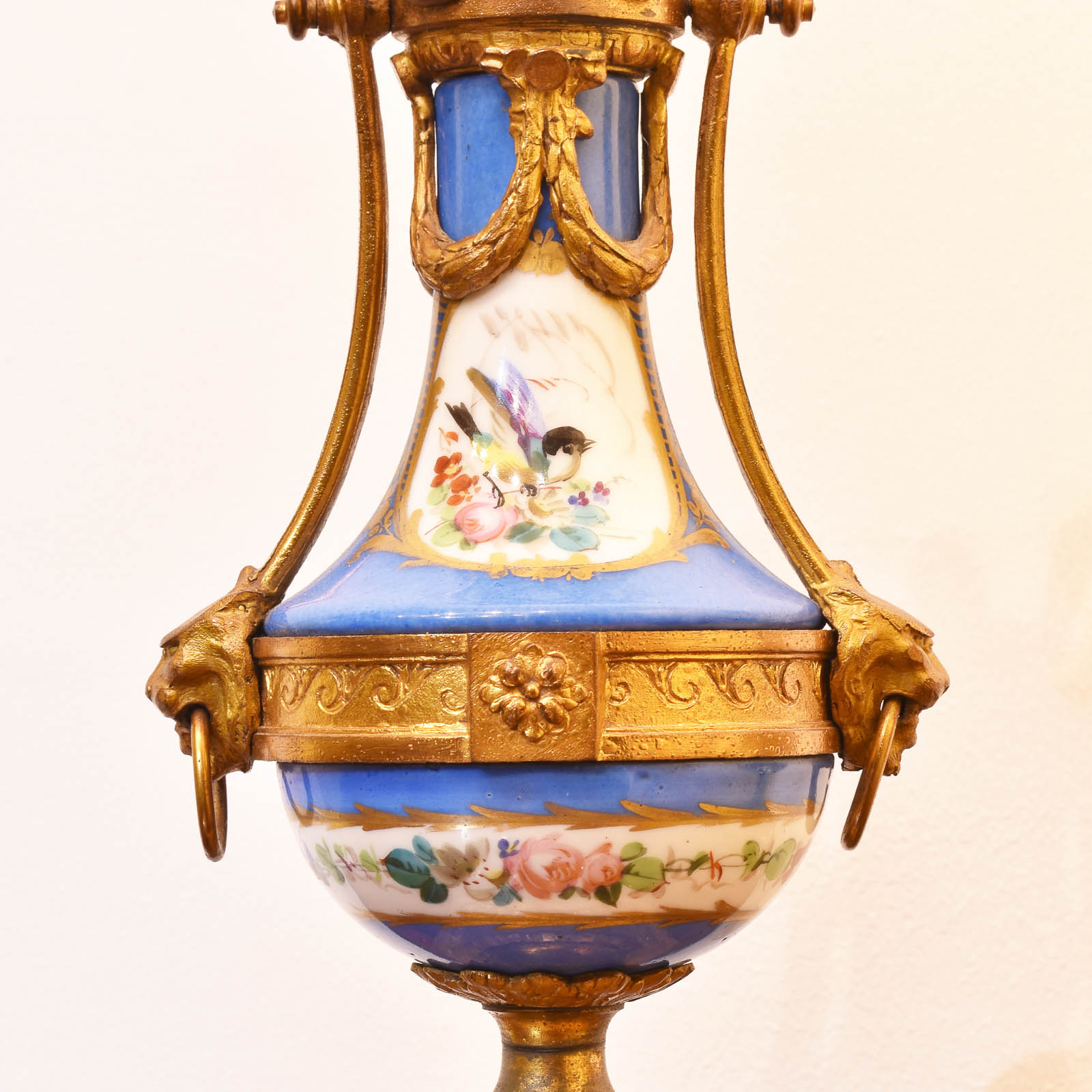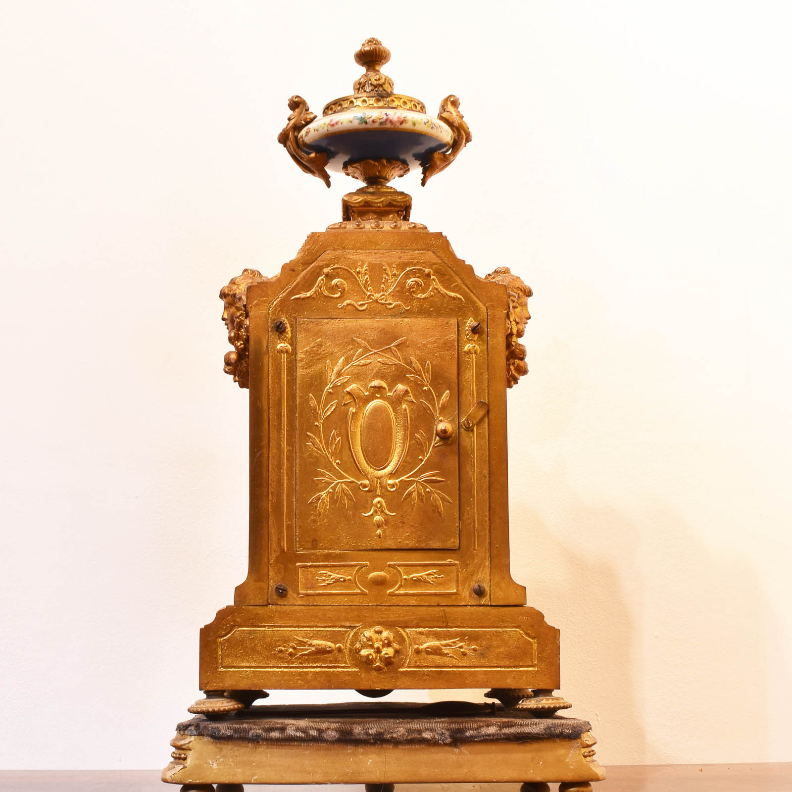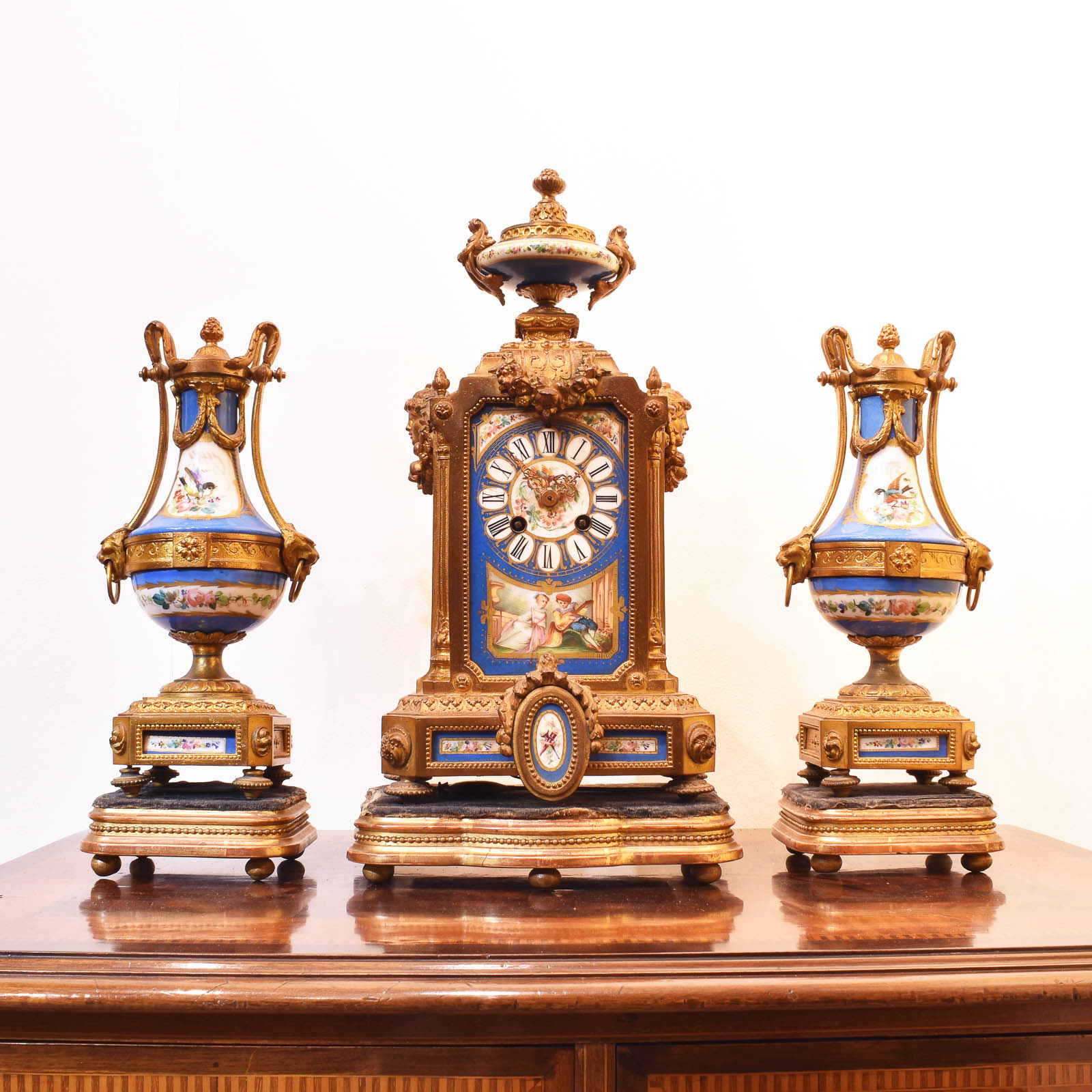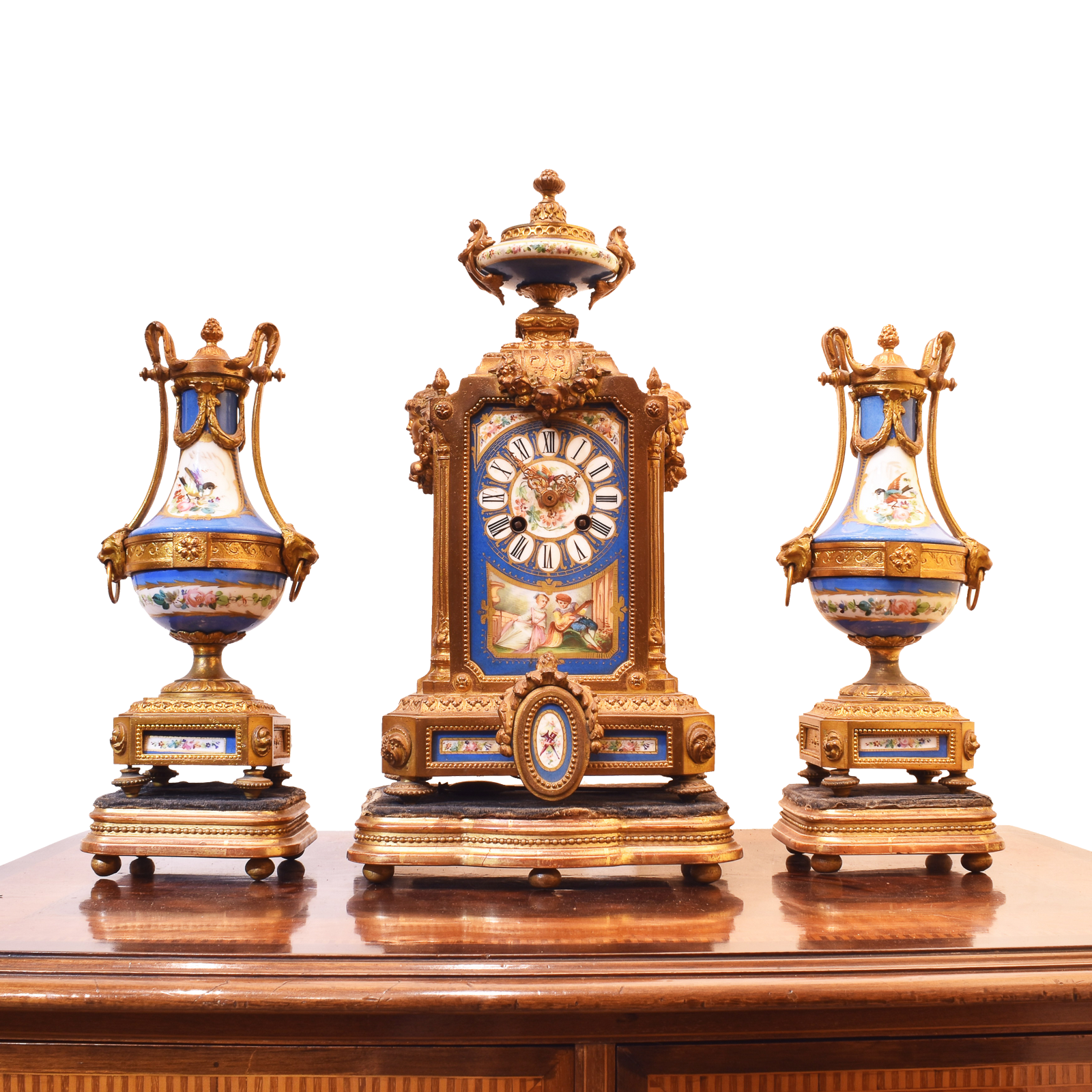 A very decorative and classical French Mantel clock ‘set’ with the most beautifully painted Sevres panels and painted Garnitures. The clock has a full painted porcelain Sevres dial with very fine fret cut hands. The decorative case is cast from Spelter (a Zinc and Copper Alloy) then Gilded. The clock has a rich warm glow and stands on gilt wood plinths, these do not have to be used if height is restricted. The clock has a high quality 8 day movement as you would expect with clocks from Paris and will be fully serviced and sold with a full 24 month guarantee.