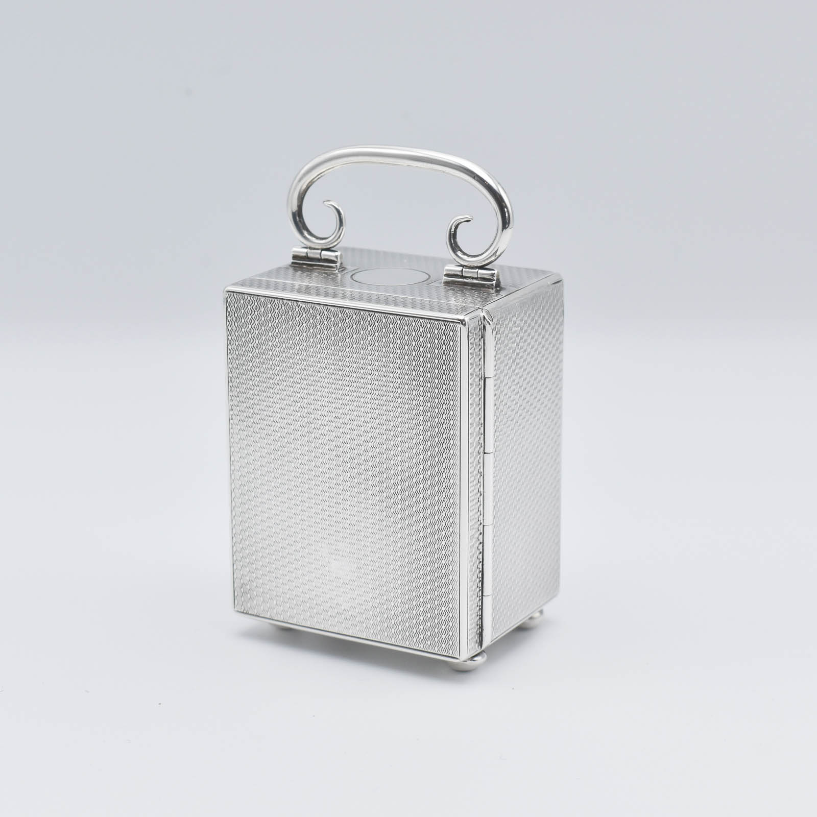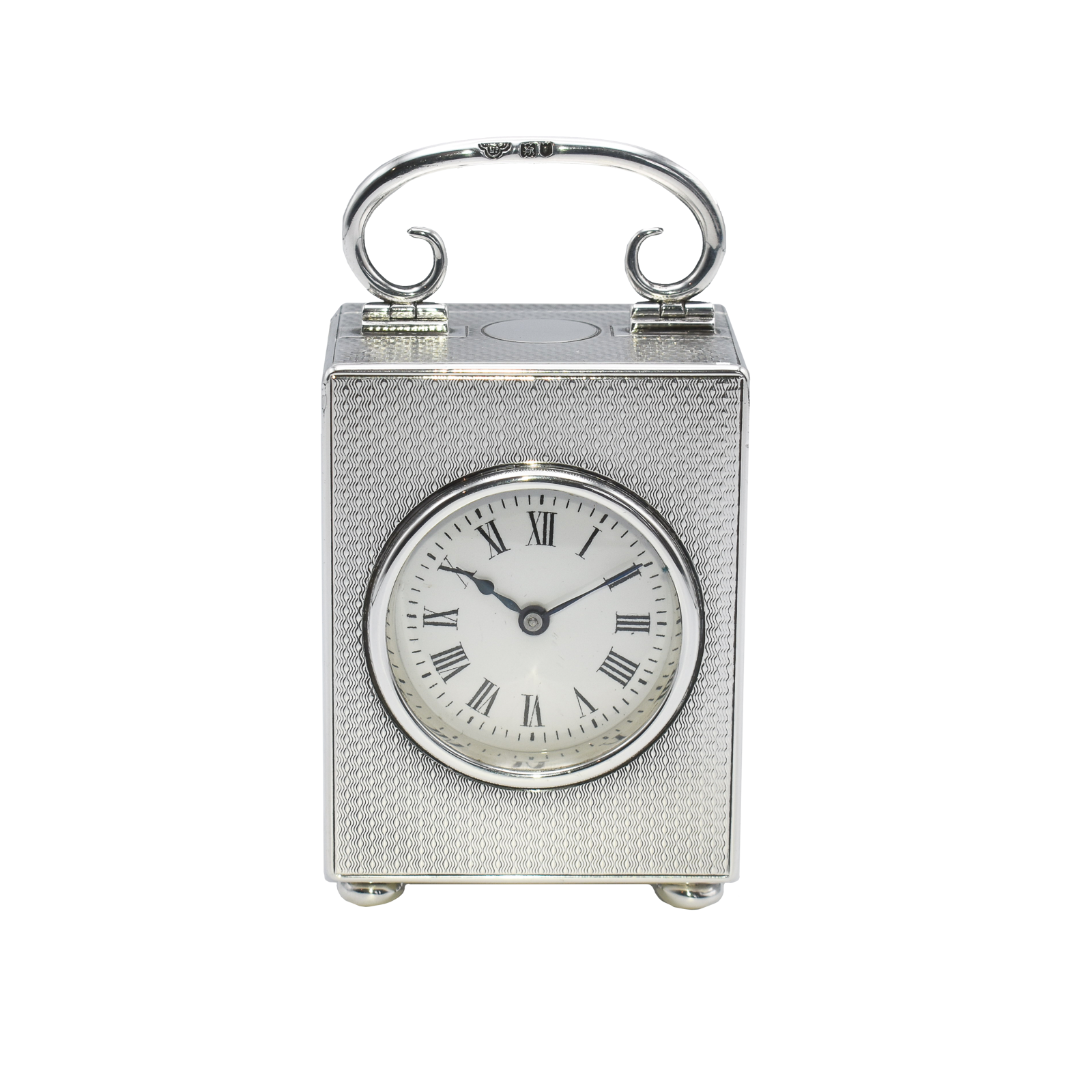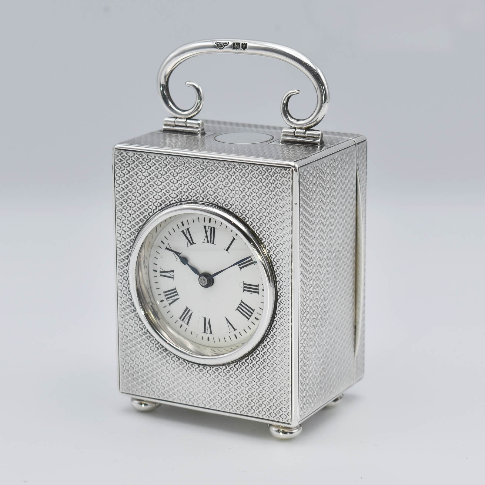 This fine Silver timepiece was made in 1905 by the Goldsmiths & Silversmiths Company of Regent Street, London. The solid Silver ‘engine turned’ case has the classic ‘C’ scroll handle which folds. The movement is wound from a turn key behind the door and runs for a week. This clock has been fully serviced and is sold with a full 12month Guarantee.
