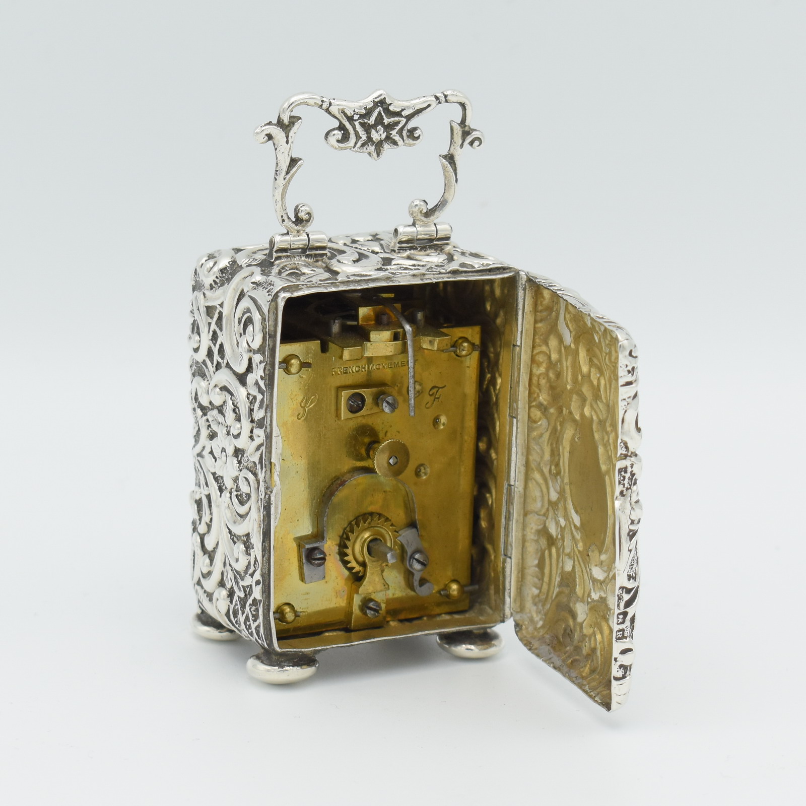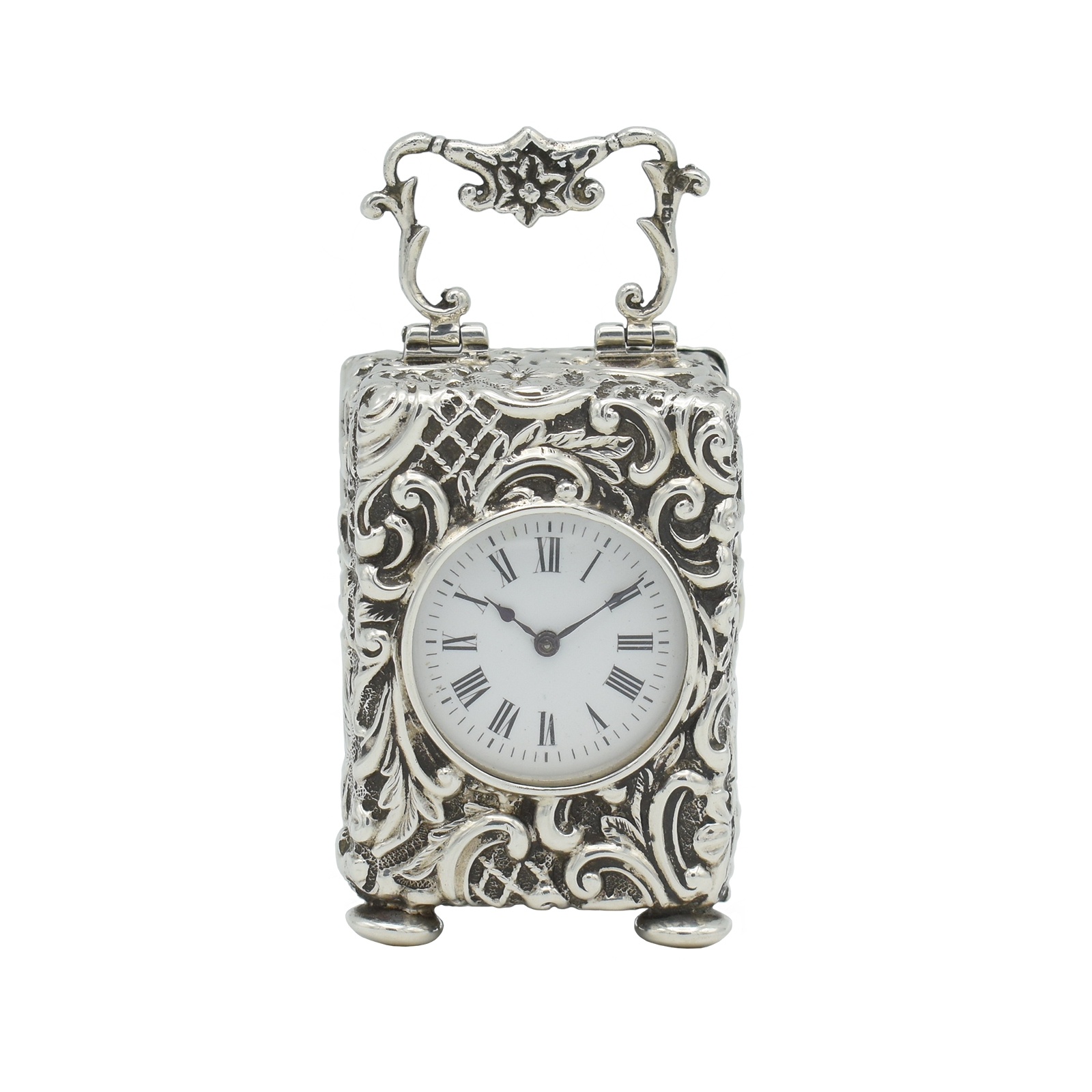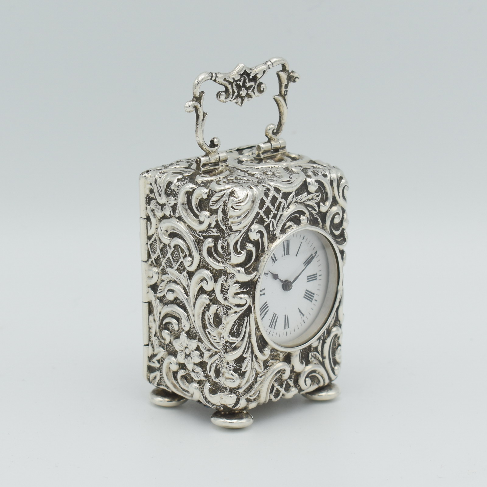 A small solid silver ‘repousse’ cased carriage timepiece with ornate handle and an 8 day key wound movement. This clock bears the hallmarks of Rattray & Co of Dundee and has a letter stamp of a ‘p’ in a shield. We are not sure if this dates it to 1910 or 1938 . The movement has been fully overhauled movement makers. A very attractive and small silver timepiece.