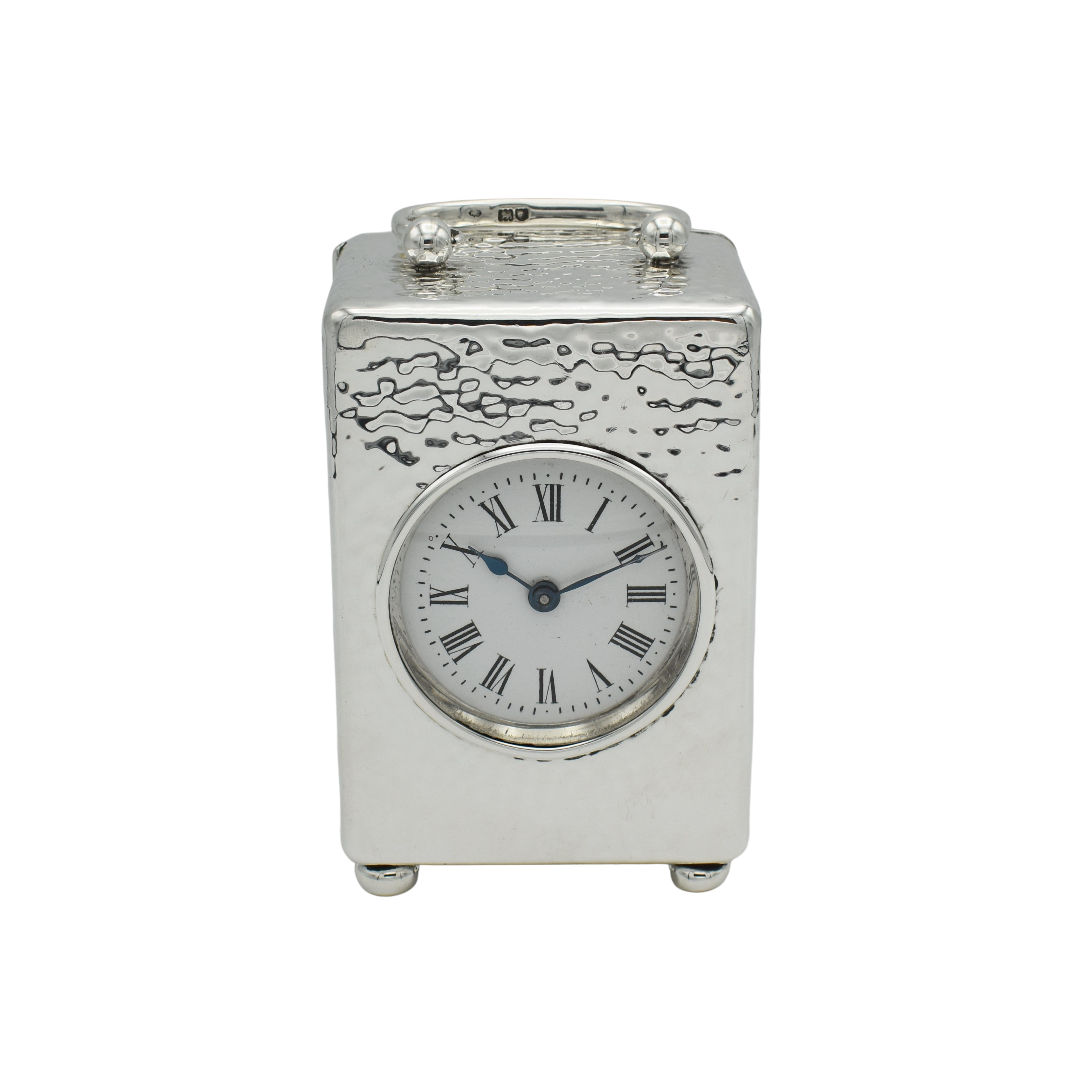 A fine, solid silver hammered case carriage timepiece with an enamelled dial and fine blued steel hands. Standing on small ‘Bun’ feet.