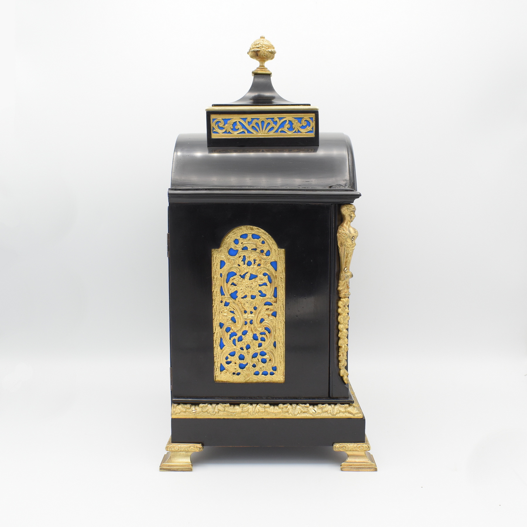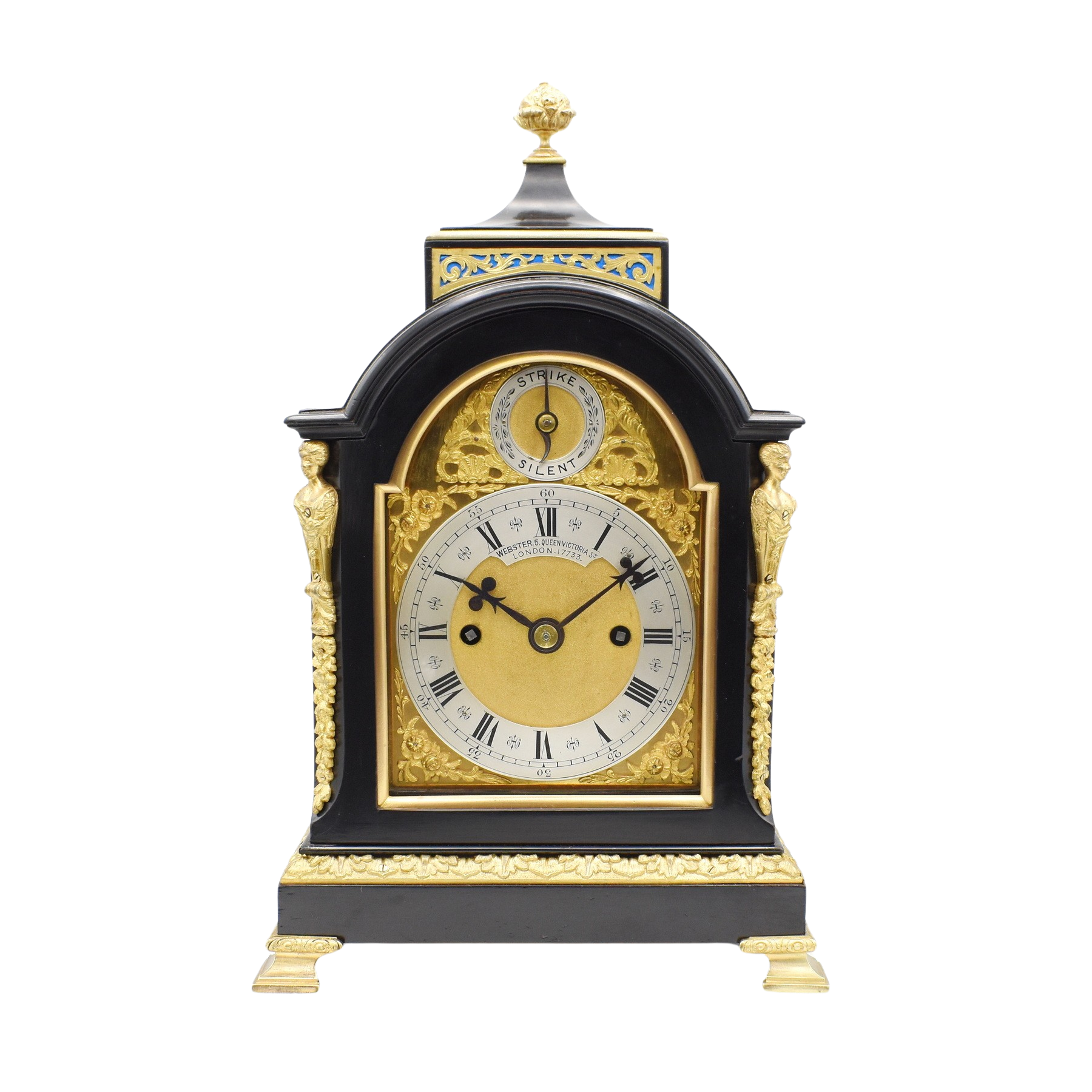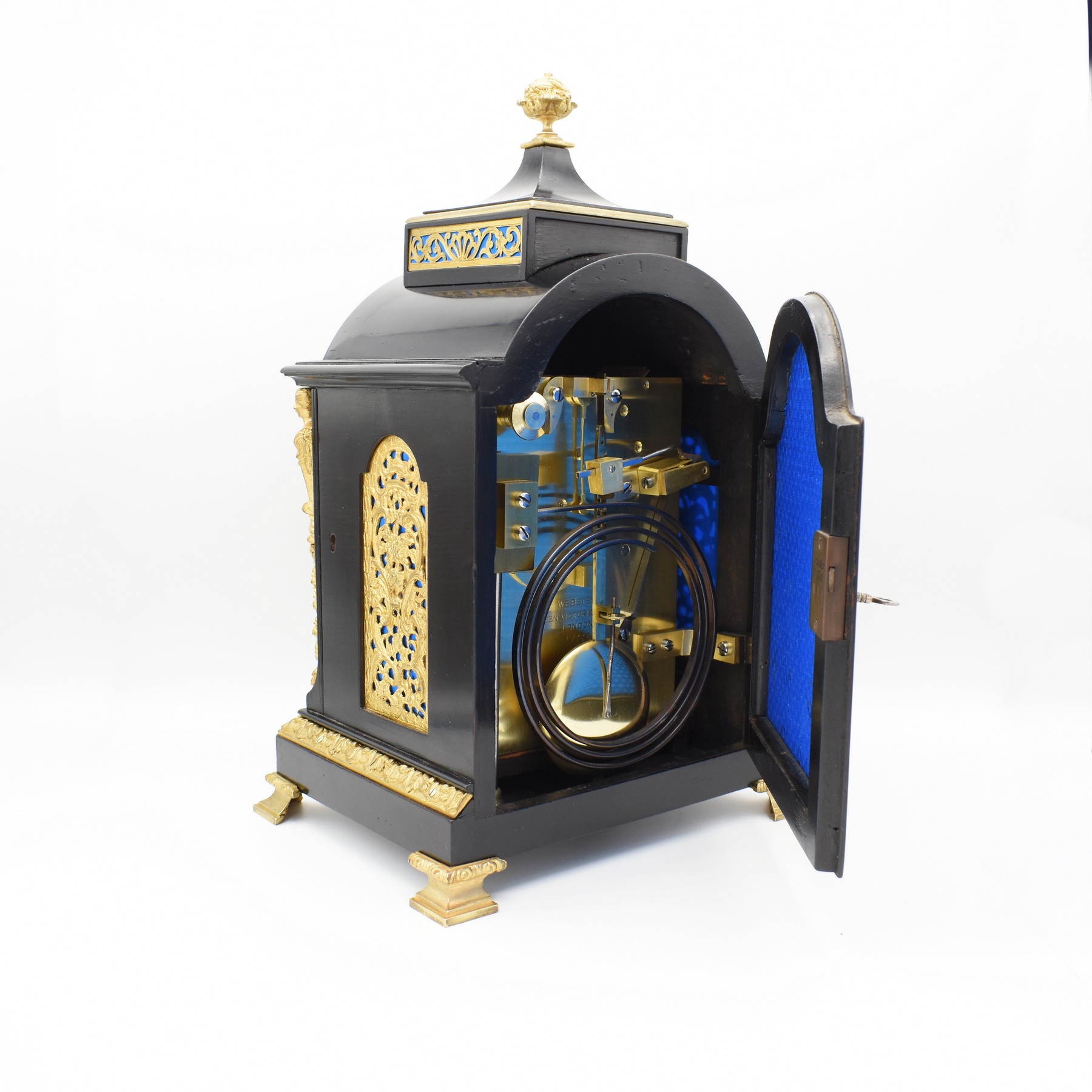 A remarkably small bracket clock by Webster of Queen Victoria Street, London. The ebonised dome-top case is finely crafted and adorned with beautiful gilt brass mounts to the front corners, elegant cast finial to the top, and attractive decoration bordering the plinth, sitting on cast brass bracket feet. Ornamental brass plates with a lovely peacock blue silk backing to the sound frets at the sides, and a nice design to the rear door, similarly fashioned with blue silk, as well as matching panels to the top. The dial plate is brass with a fine silvered chapter ring and hand-matted dial centre, signed “Webster, 5 Queen Victoria St. London N.17733”, surrounded by floral gilt brass decorations with silvered strike-silent function to the arch, meaning the strike can be turned off at night! The 8-day twin fusee movement is in fully restored and in great condition, striking the hour and half hour on a mellow gong, complete with the original numbered winding key, which is particularly rare. William Webster founded the company in 1711 and ownership was passed down from father to son over the next two centuries, eventually to Richard Webster III, who moved the business to the new premises at 5 Queen Victoria Street in 1876. After the death of her husband in 1861, Queen Victoria famously wore black for the remainder of her life, and it became a very fashionable colour at the time, with many clocks made in this ebonised style. This clock would’ve been manufactured and retailed circa 1880, towards the end of the Victorian era. Dimensions listed are to the top of the finial.