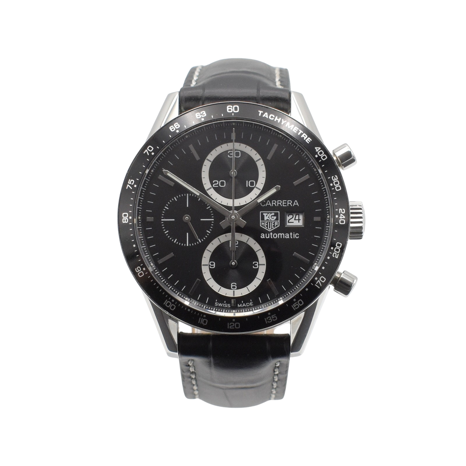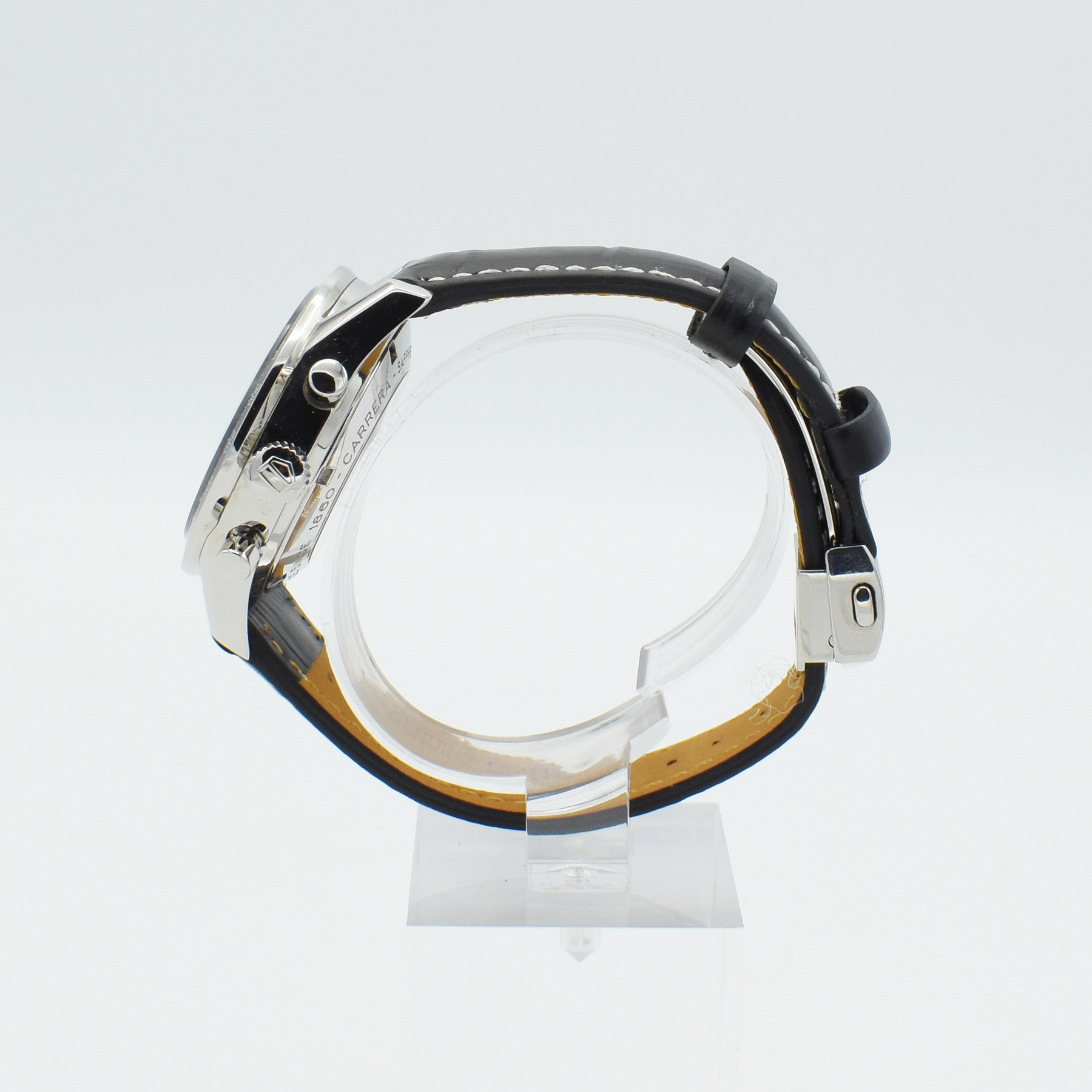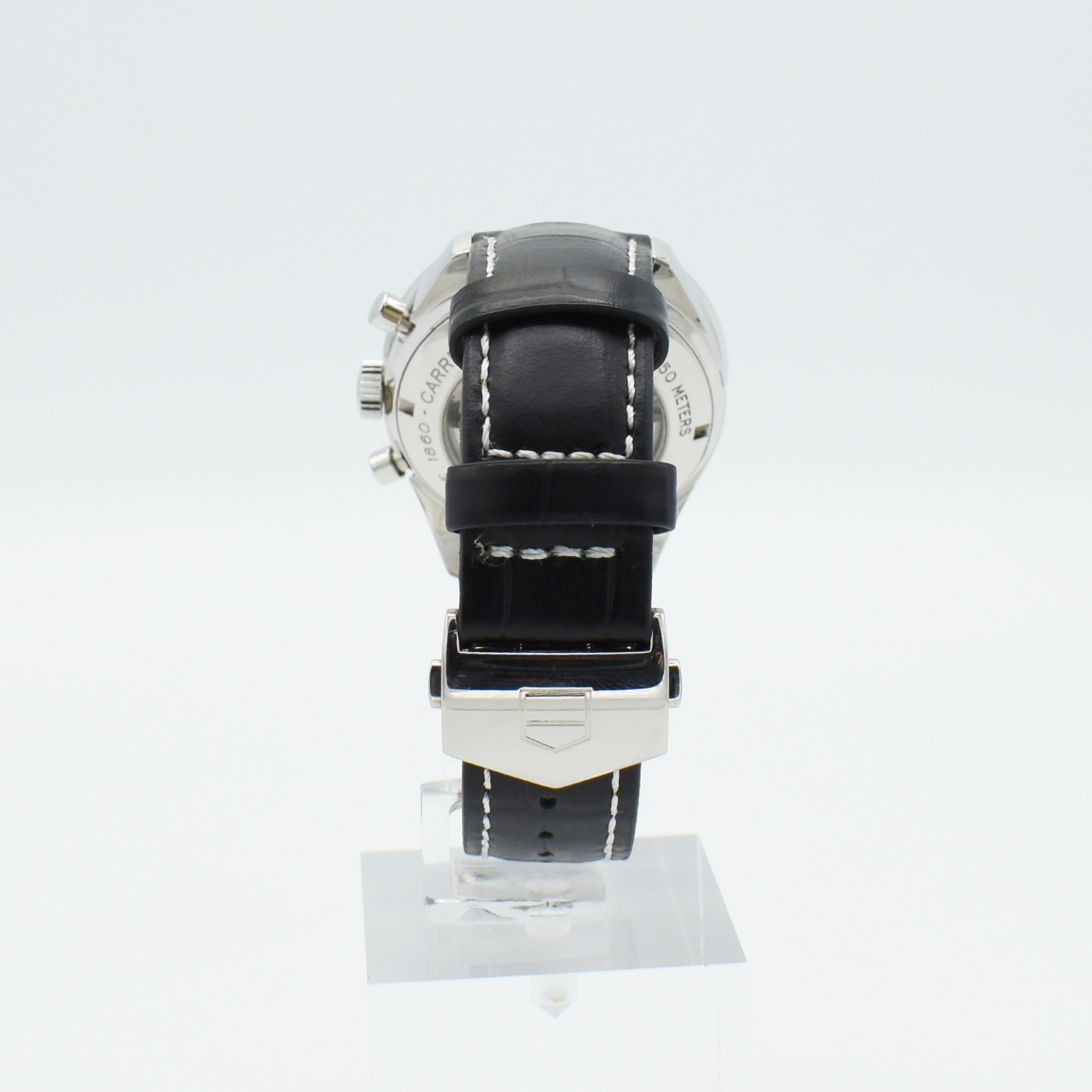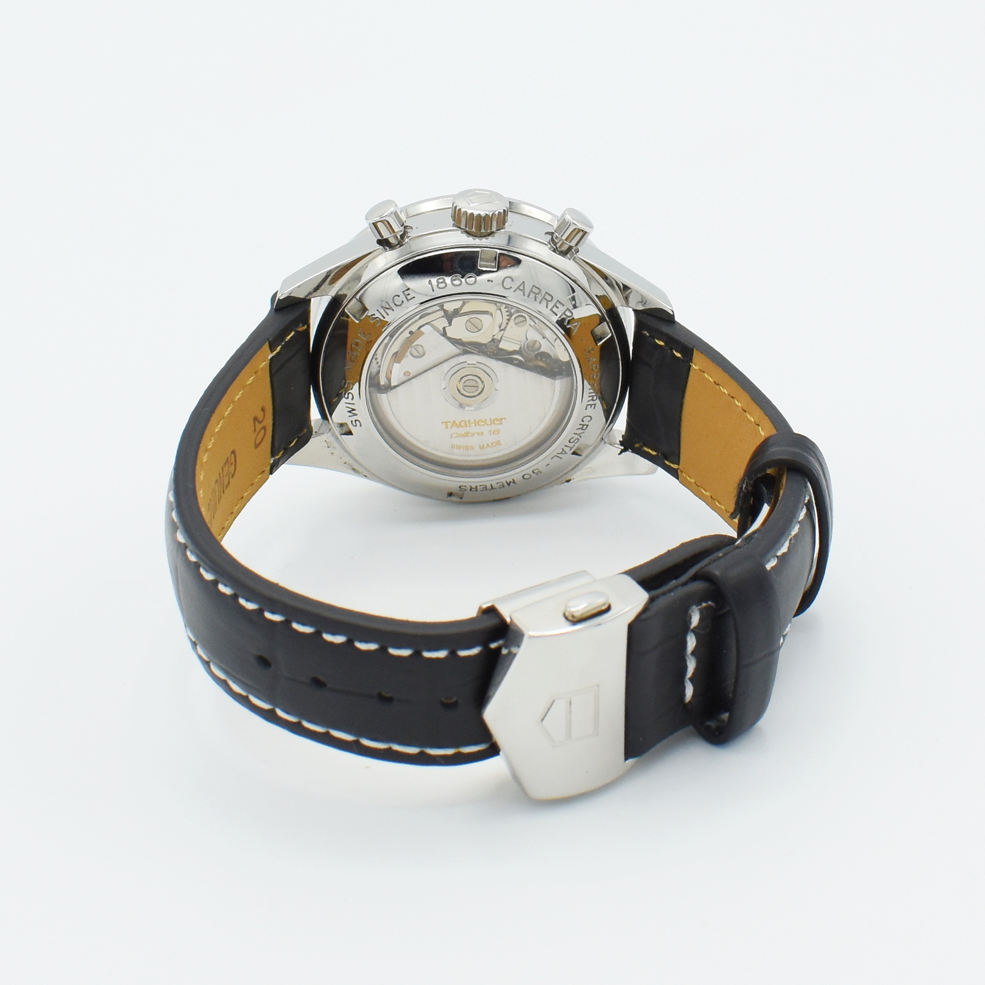 A ‘like new’ TAG Heuer Carrera automatic wristwatch in stainless steel, measuring 41.5mm in diameter (without the winding crown). The dial of this watch is nicely balanced and somewhat classic with stainless steel baton indices and hands against a gloss black dial, as well as black tachometer graduated bezel. Luminescent batons on the minute and hour hands, and lume dots at the hour marks on the rehaut. At the 12 and 6 hour marks are the 30 minute and 12 hour subdials, respectively, with engine turned centres and bright silver outer rings, which are particularly attractive. At the 9 hour mark is the more subtle 60 second register, and at the 3 hour mark is the date calendar aperture, with black numerals on a white background. Solid Valjoux 7750 automatic movement, with sapphire caseback to view rotor. Model reference CV2010, serial number YS2852, dating 2009-10. This watch is in great condition and is supplied with a new leather strap. 24 months R.T.B. guarantee.