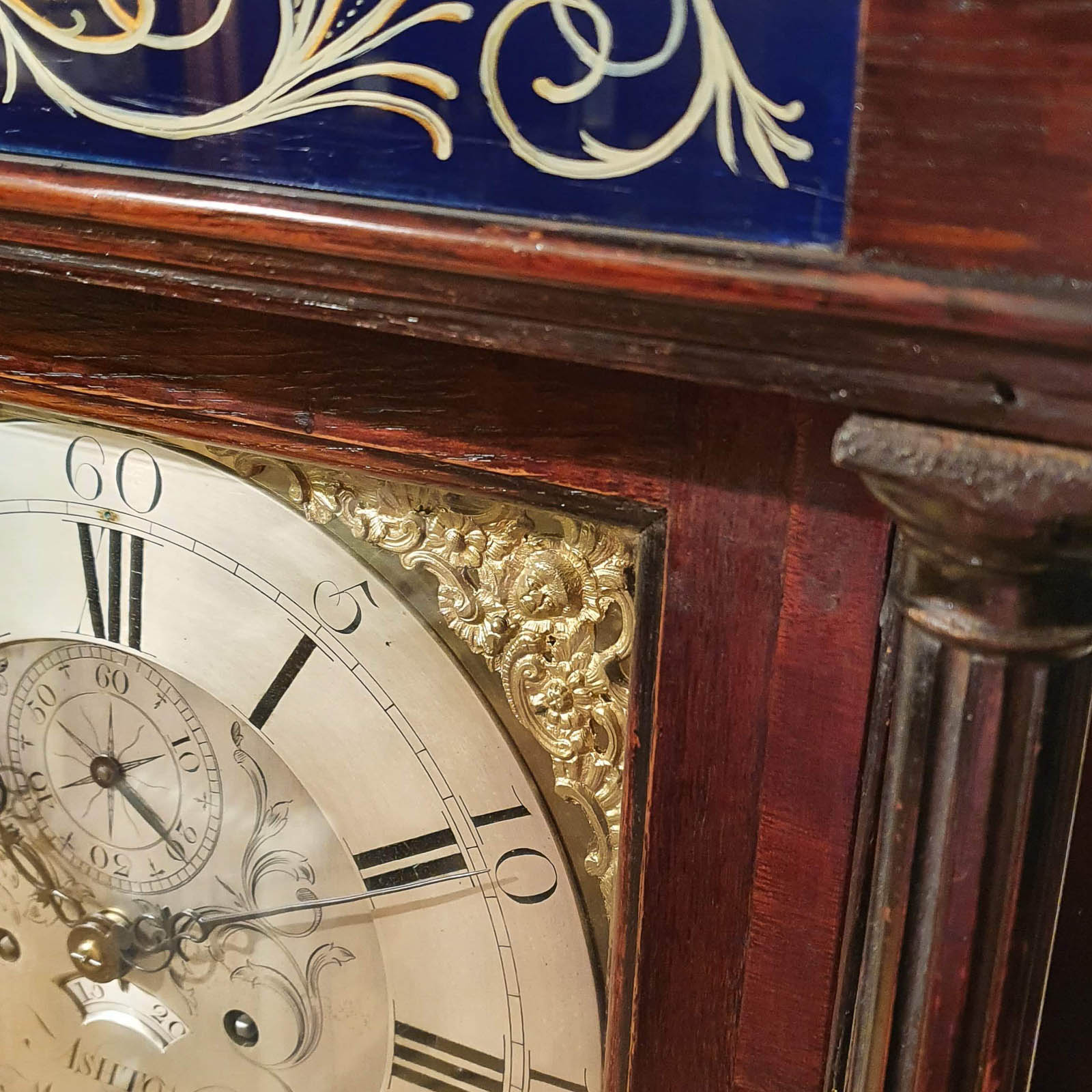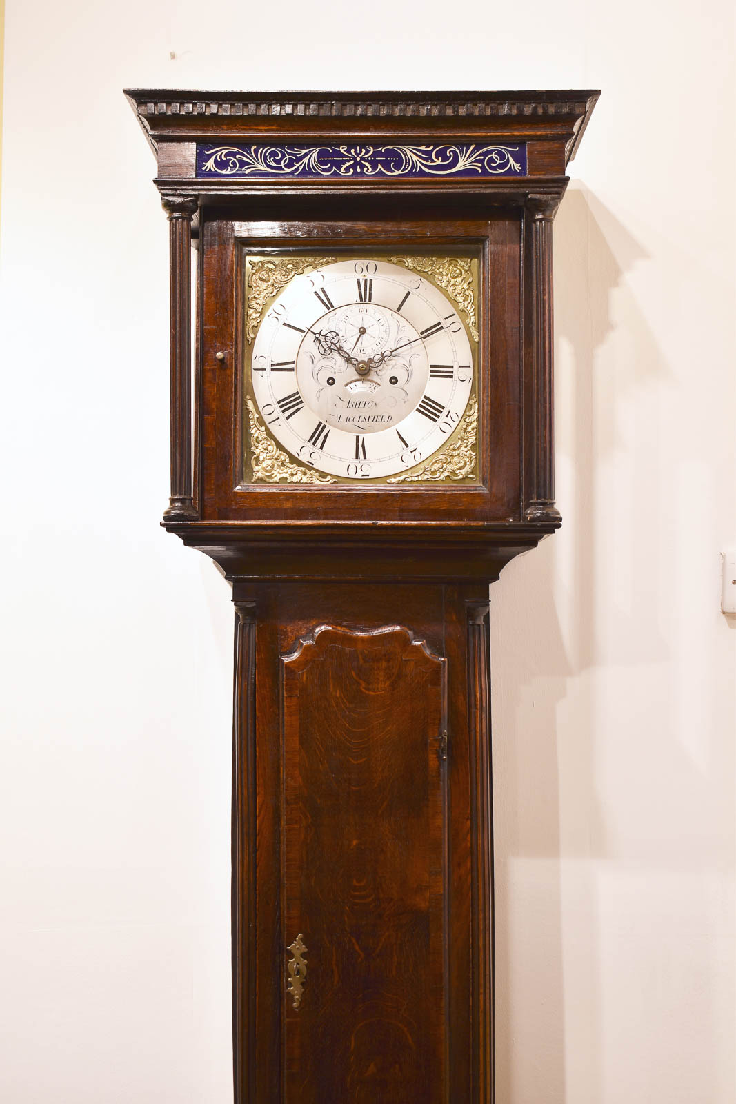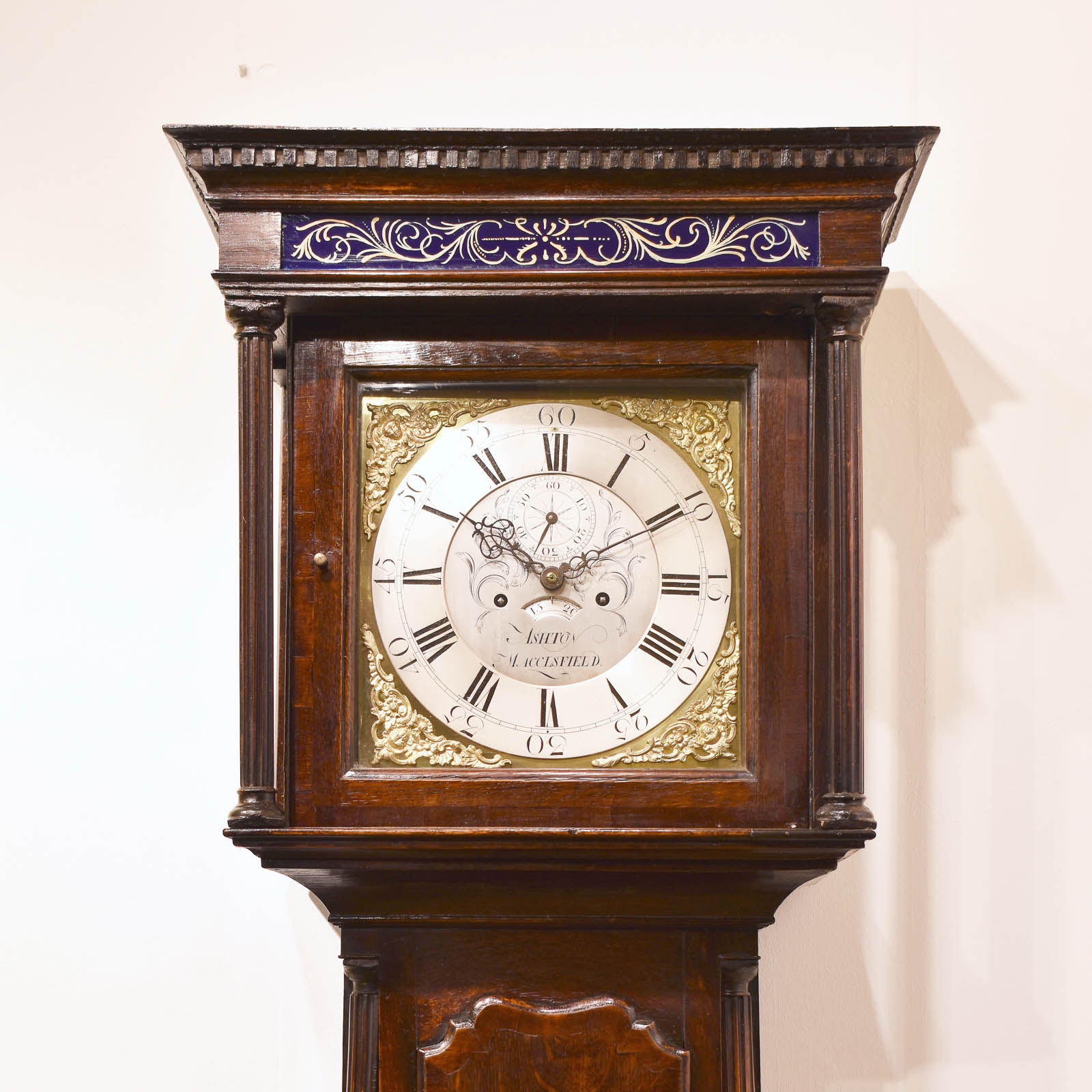 A fine oak Lancashire Longcase clock of good proportions with full 12 ” brass dial showing silvered Chapter ring, Calendar and dial center with gilt spandrels to the dial corners. The hood with columns and a dentil moulding, crossbanding around the door and reverse painted glass known as Verre eglomise above. The trunk in Oak with mahogany crossbanding, quarter columns and panelled base.Thomas Ashton of Macclesfield was working from 1760-95 and is listed in Clock and Watchmakers of the World, book by G.H.Ballie. Fully restored and sold with a one year guarantee.