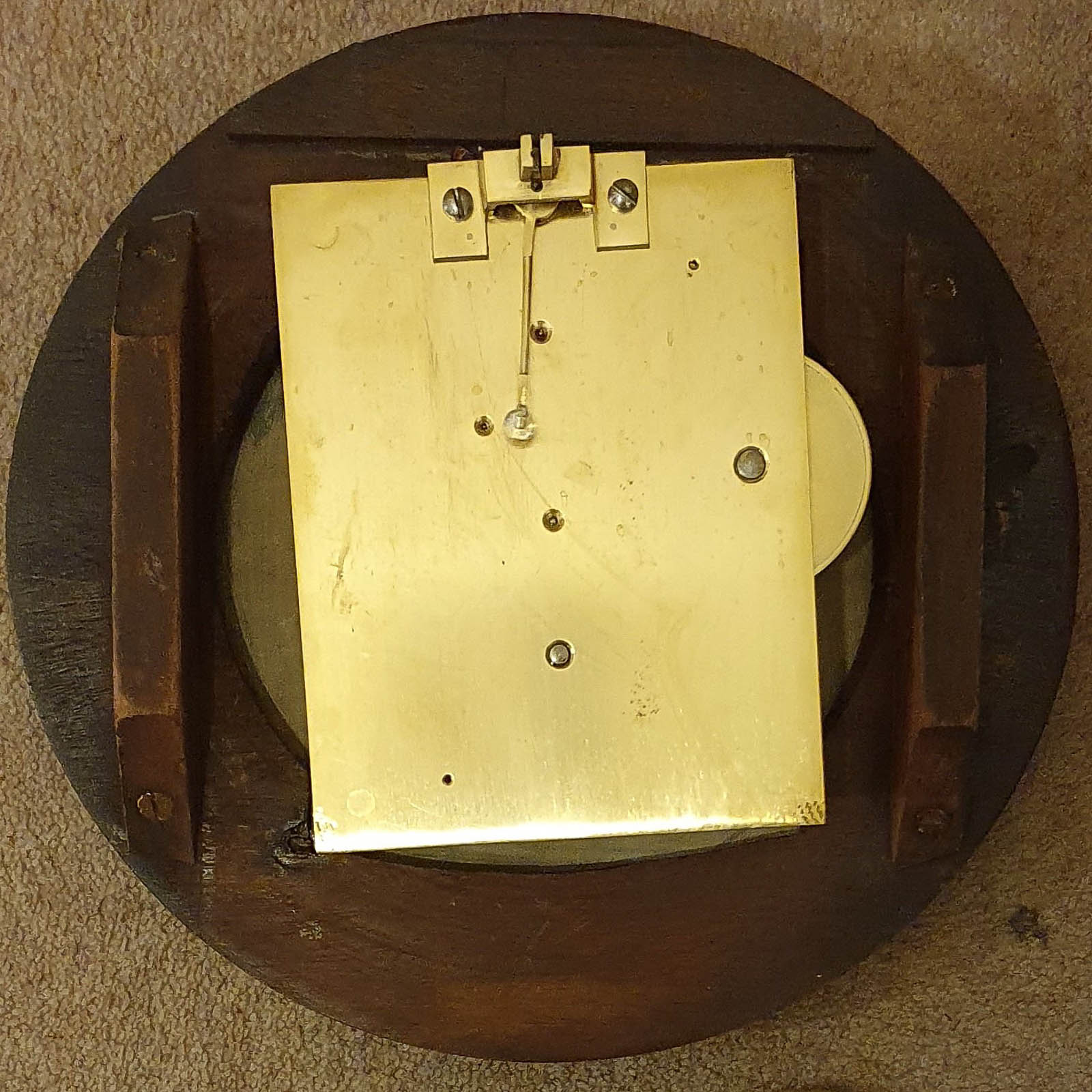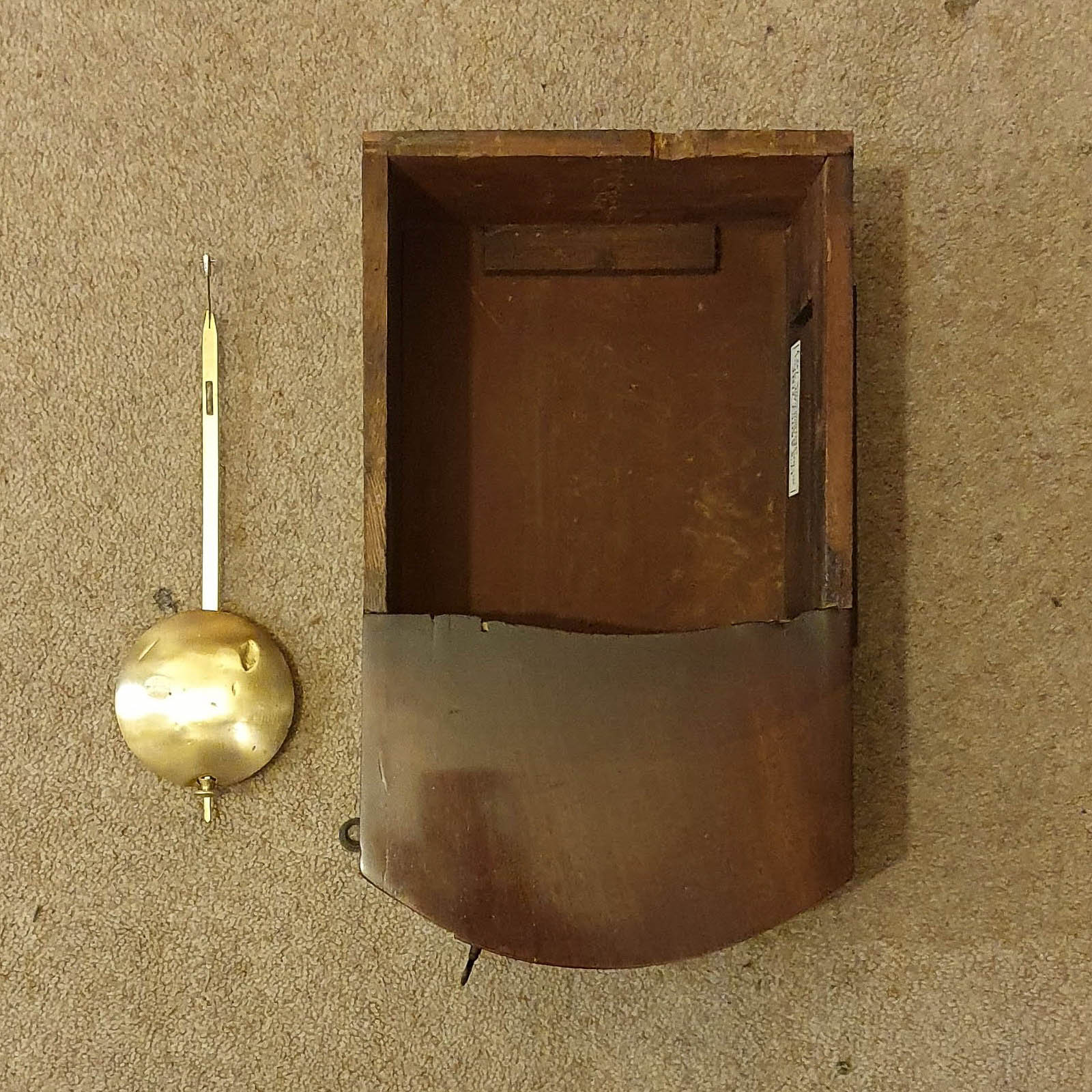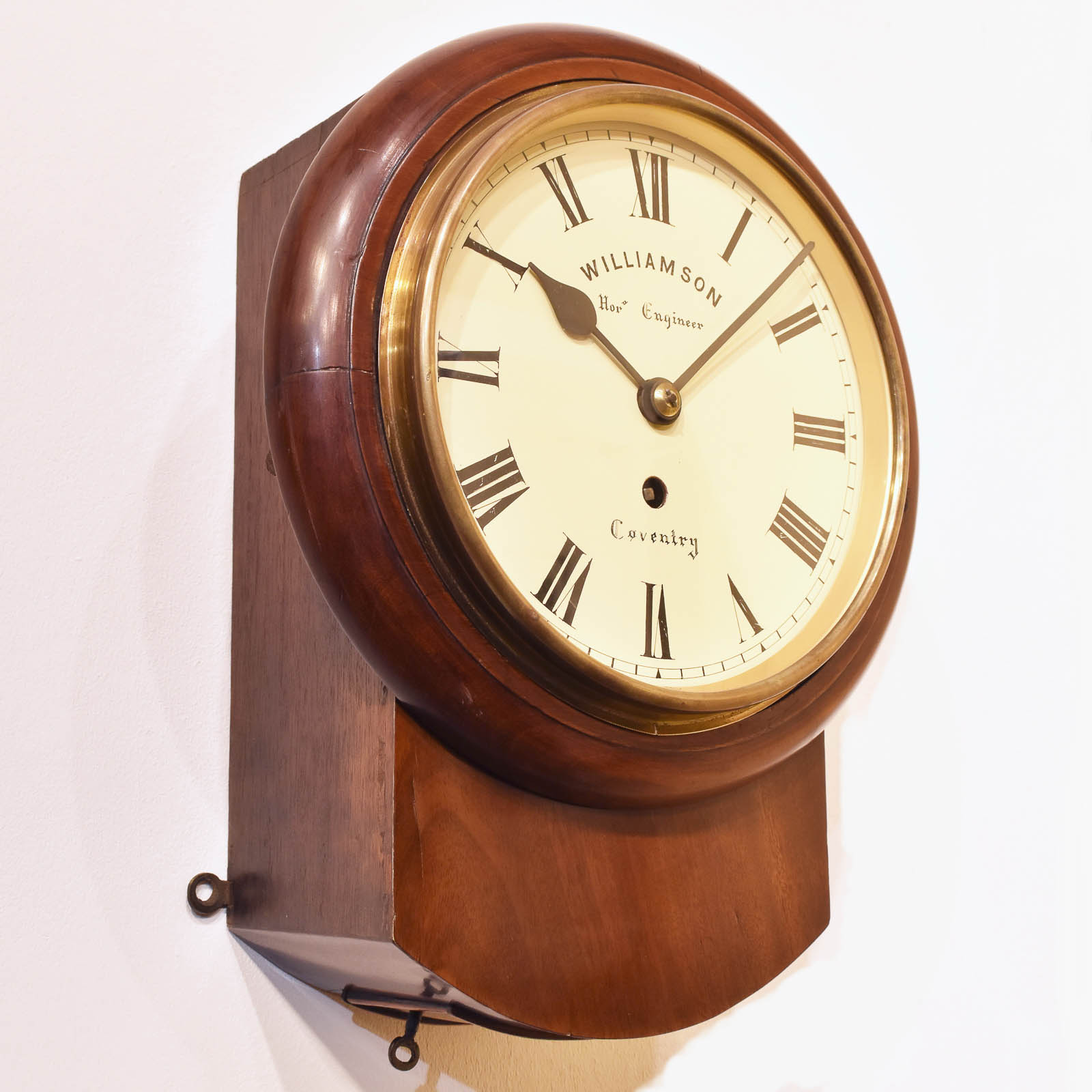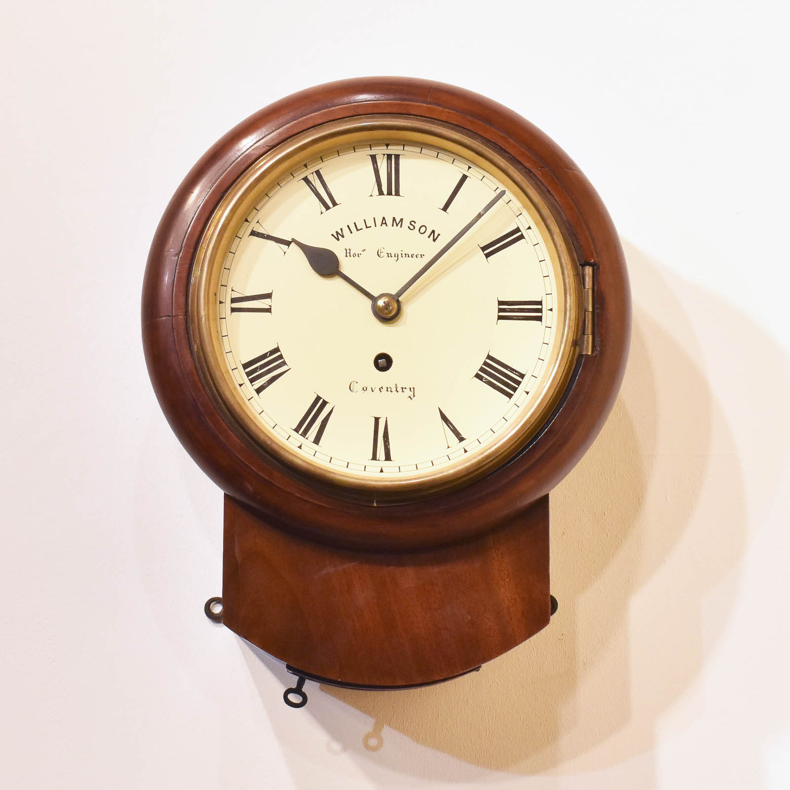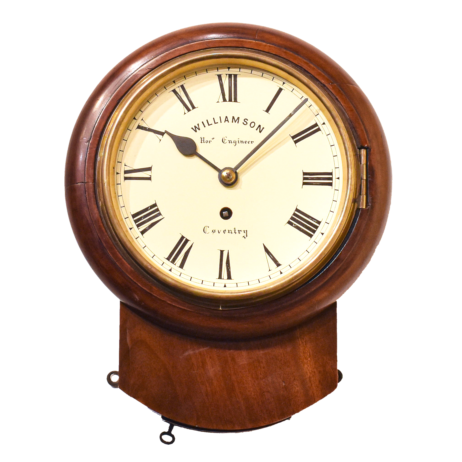 An attractive ‘drop dial’ or ‘trunk dial’ timepiece with a fine and substantial fusee movement and heavy pendulum. The case in mahogany and of good colour has one lower convex door held with a lock and key and one side door held with a traditional latch. The fully restored 8 inch dial shows the name Williamson and Horological (shortened) Engineer. Coventry. The blued steel hands and cast brass collet to the centre. This clock most likely dates to around 1870-80 and retains the two fixing points either side of the case. To fully appreciate this clock you must come and see it next to a full size examples. There is a Williamson of Coventry listed working at 1880 in the Book- Watch and Clock makers of the world. Vol 2.