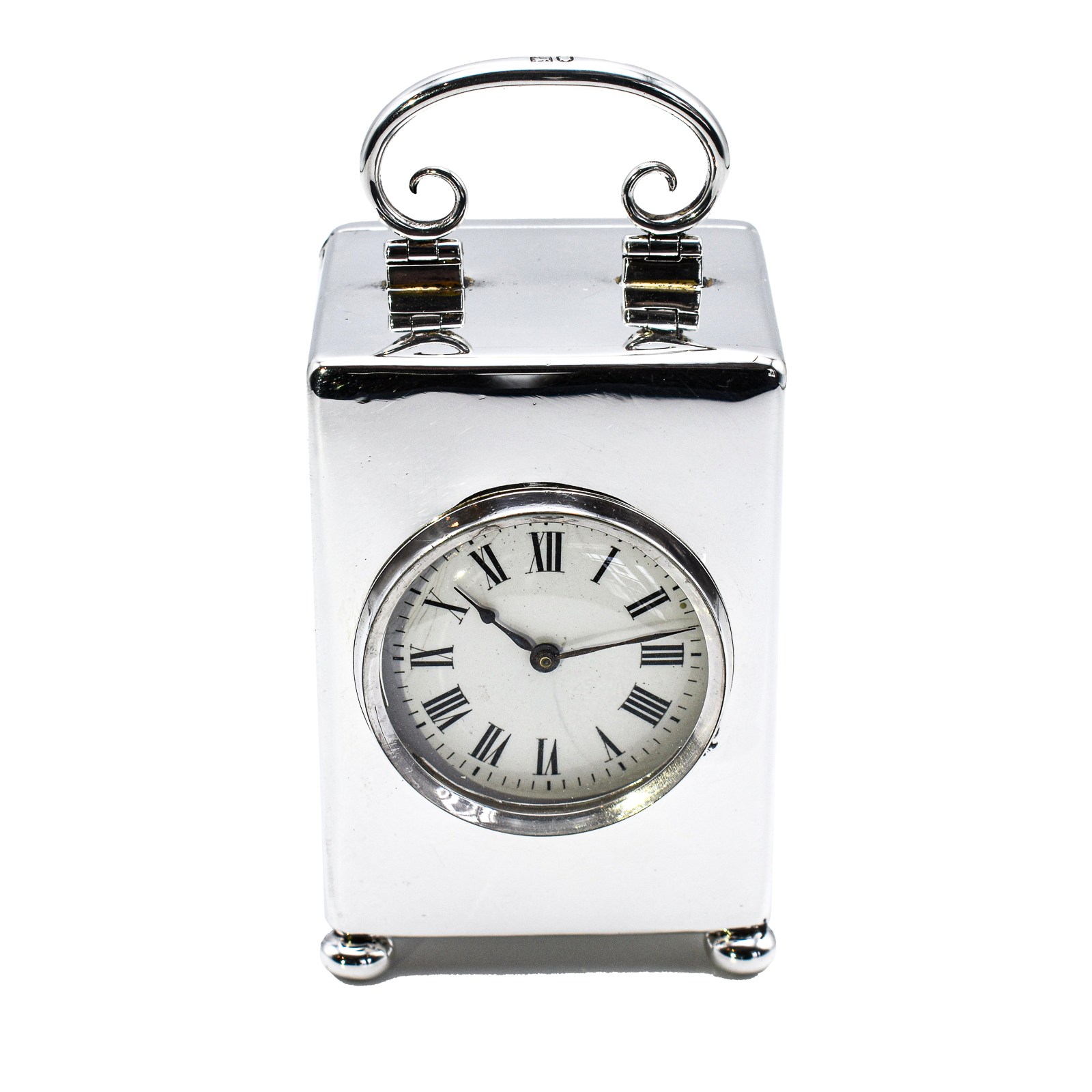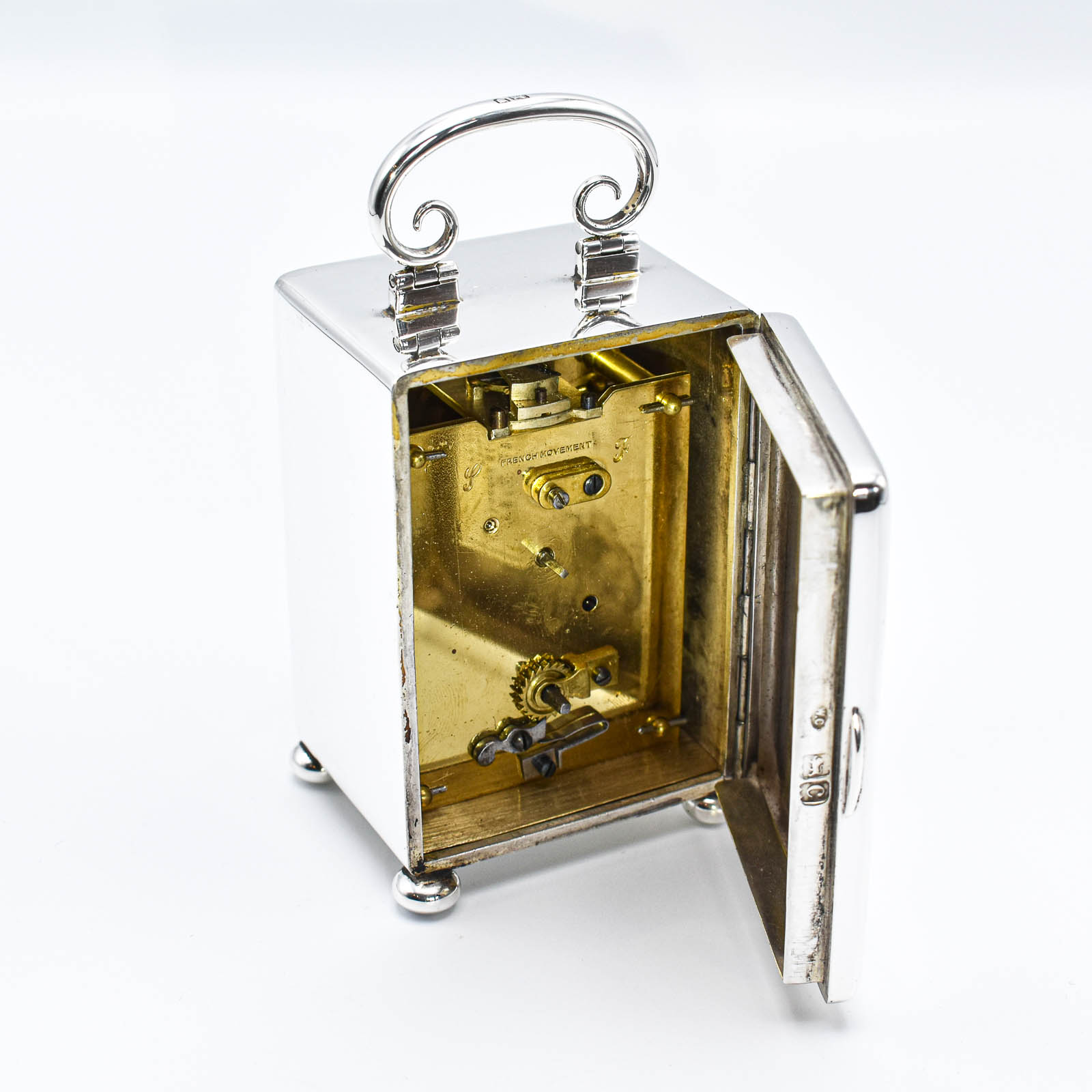 A large size solid Silver carriage timepiece with an 8 Day movement and enamel dial. The case is stamped with the hallmark of William Comyns of Beak Street, London. They were famous Silversmiths and this piece was made in 1898 with the letter c.