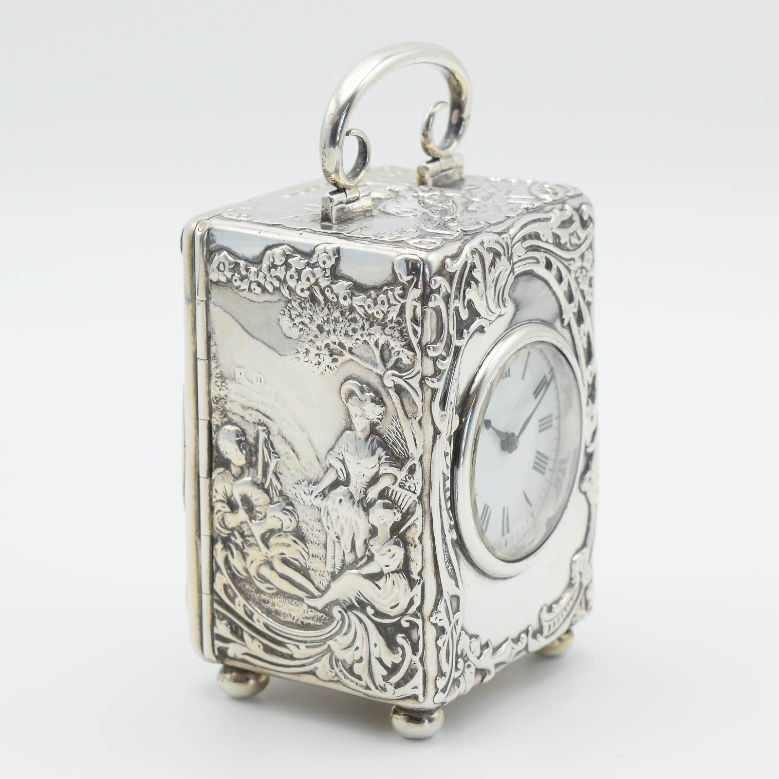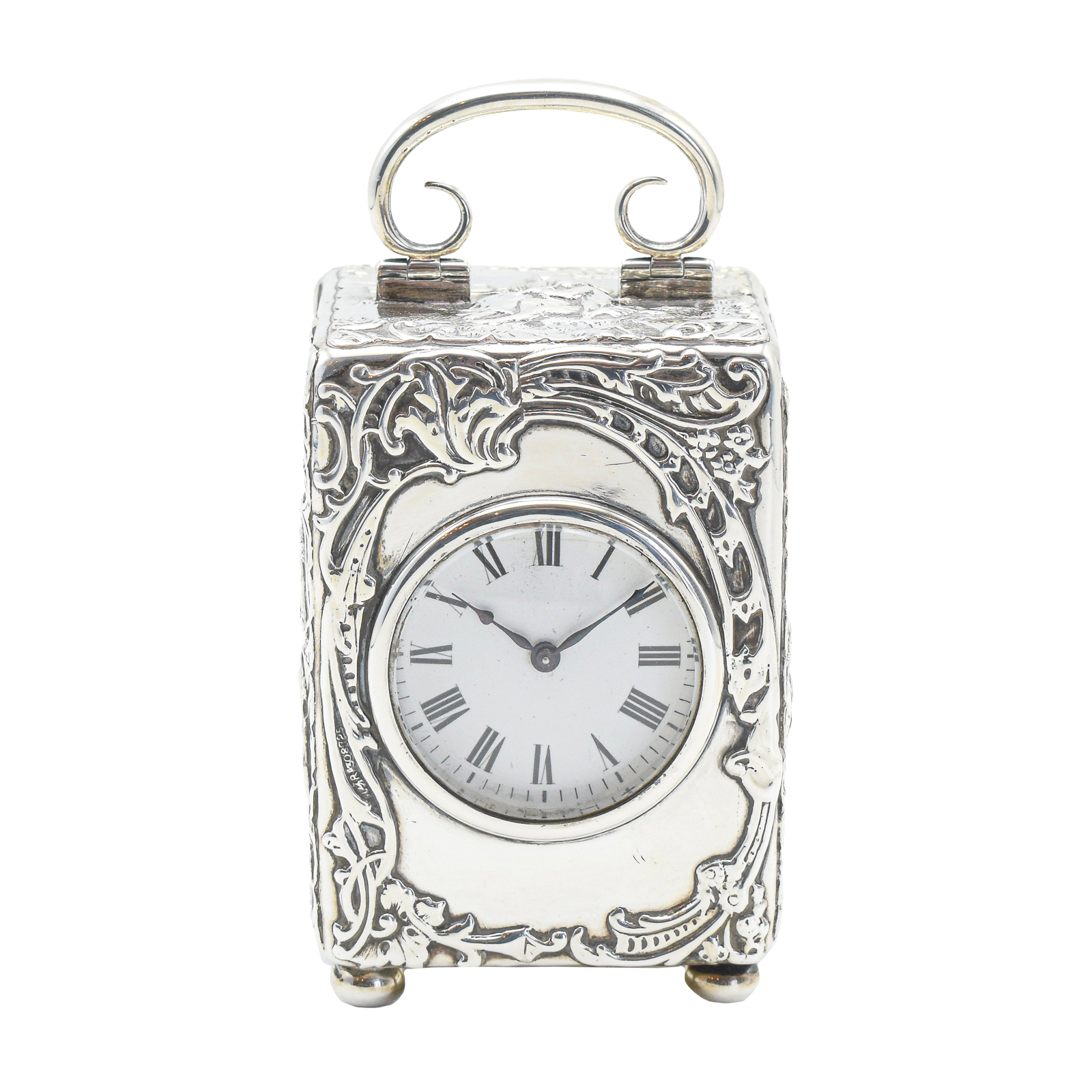 A fine solid Silver ‘repousse’ cased carriage timepiece with an enamelled dial and fine blued steel hands. The week duration movement is wound from a turn key inside the back and has been fully serviced and regulated. The clock case was made by the very respected Silversmiths – William Comyns and bears the hallmarks W.C and the letter ‘F’ for 1901. This clock is quite large, unlike many smaller Silver timepieces and sits nicely on mantel or shelf. A beautiful object and good investment. Sold with a 24 Months R.T.B guarantee.