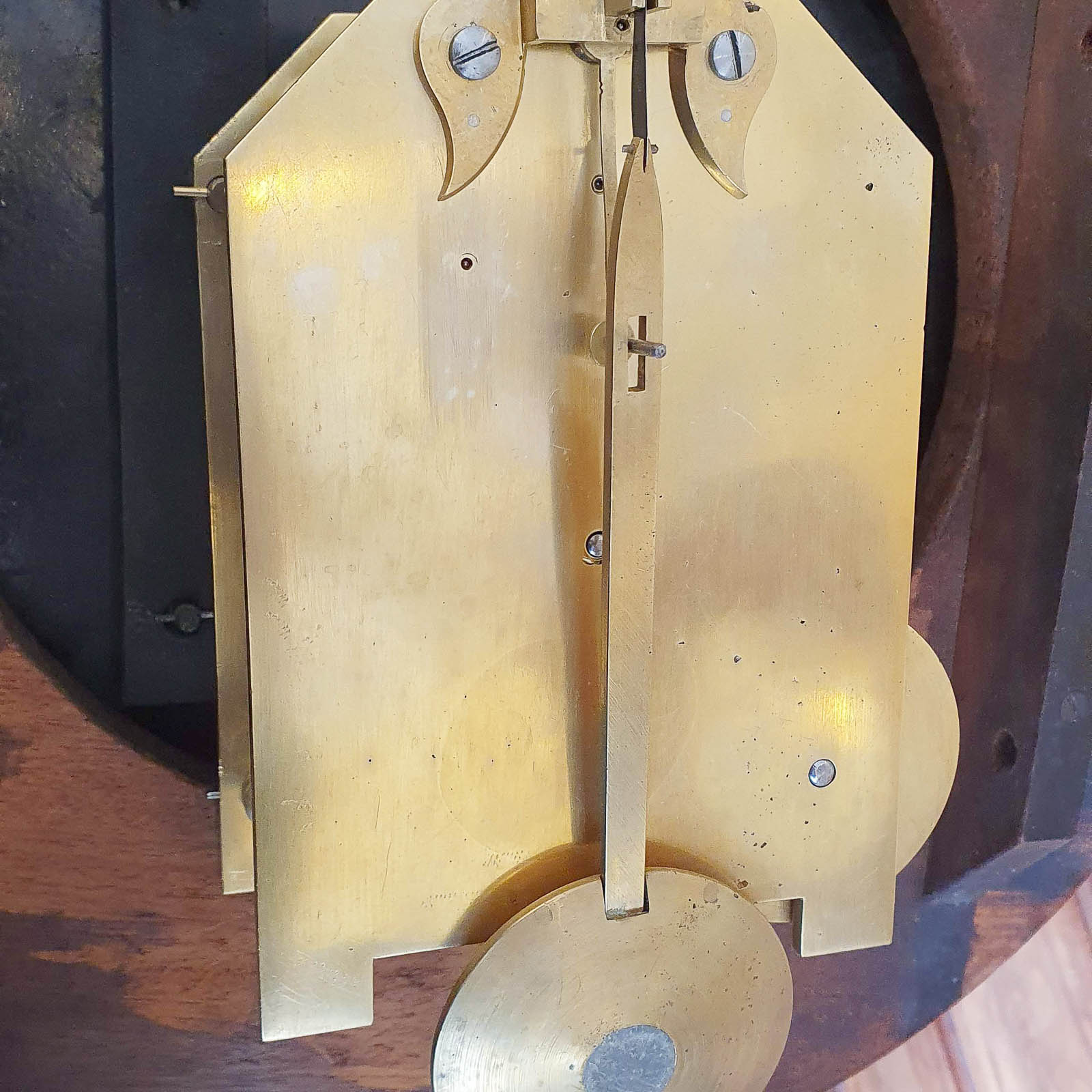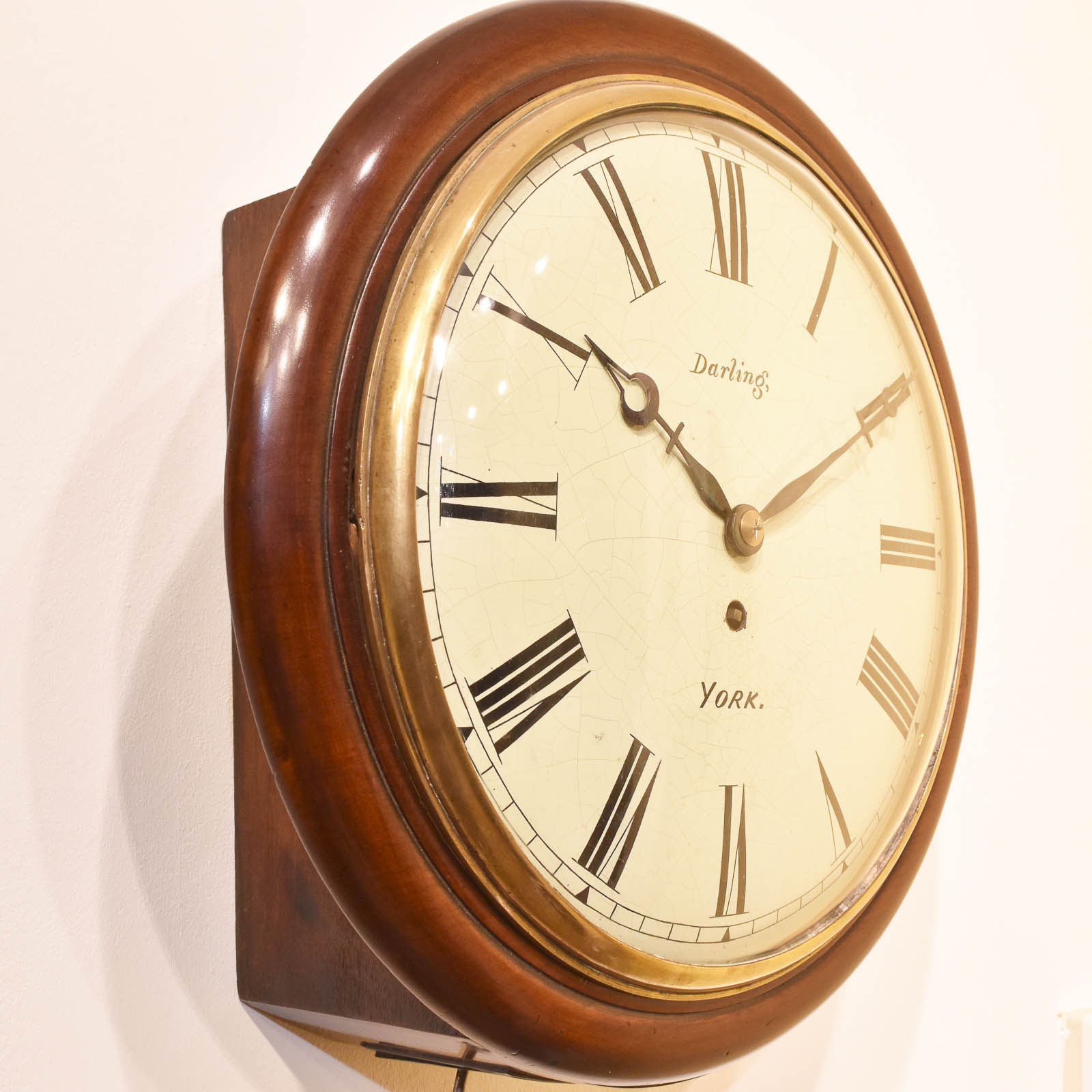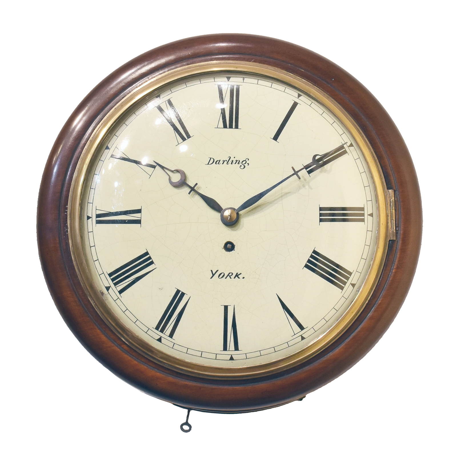 A fine 12″ convex dial wall clock in a mahogany case with a narrow bezel. The fully overhauled movement is single fusee and has shaped cast plates . The fine blued steel hands are original and very attractive. The original enameled dial is signed Darling of York. William Darling was working from 1820 until 1858 at 42 Coney Street , York . The case has two doors, the side door held with a latch and the convex bottom door held with a lock. The cast brass bezel held with a latch. The dial shows signs of age but is still very good. Movement is fully Serviced/Overhauled.