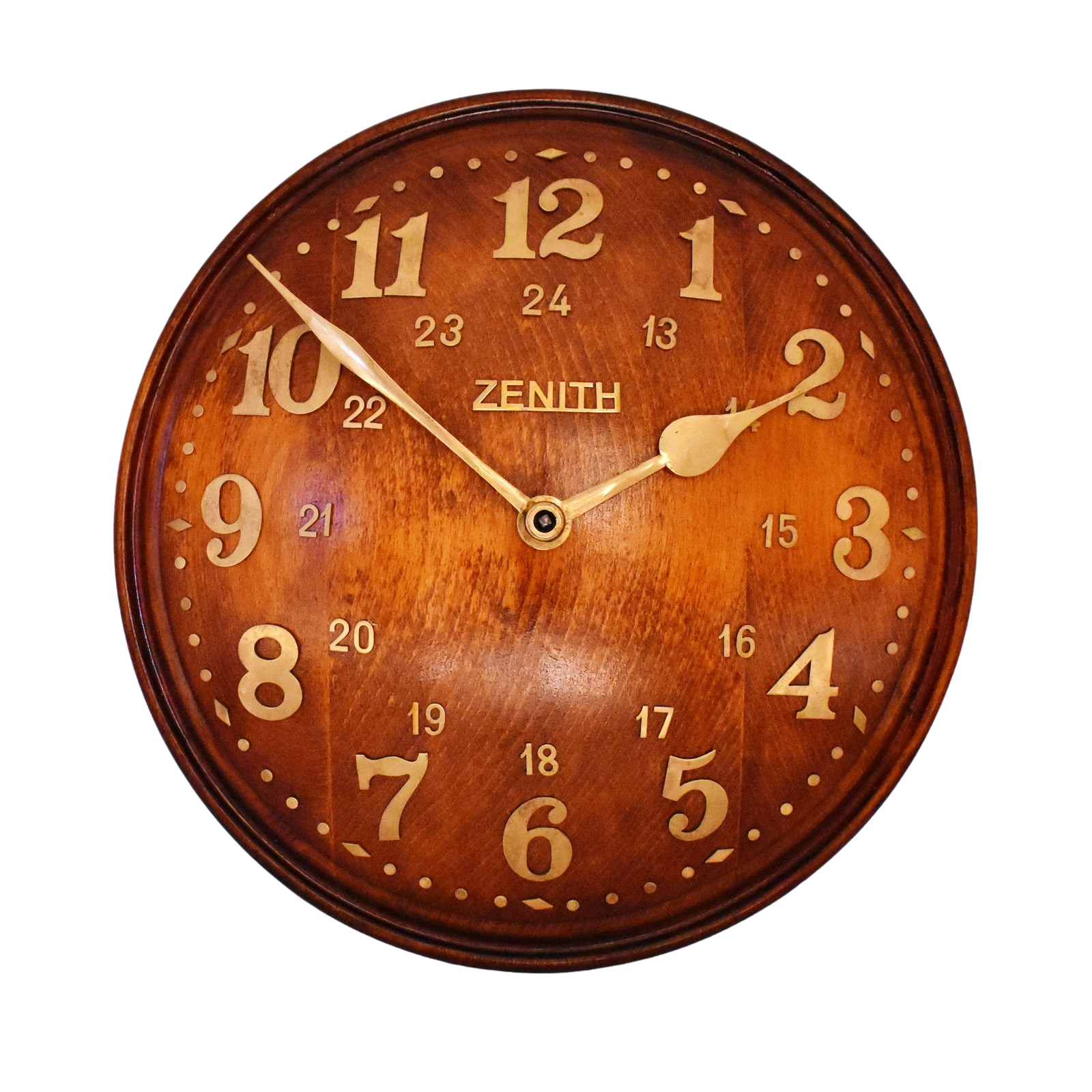 A twist on the traditional dial clock. This timepiece was made by Zenith (the famous Swiss Watch manufacturer) and features a superb quality Swiss, 18 day movement with a center winding position and domed dial made from what we think is Oak but could be Beech! It’s a hard to tell.  This example is roughly 13″ size and has the addition of a 24hr dial within the 12hr chapter ring.  Mainly Heals retailed these clocks (timepieces) from the 1930’s to 1960’s and they have become quite collectable in recent years. With brass numerals and hands and supplied with a winding key.